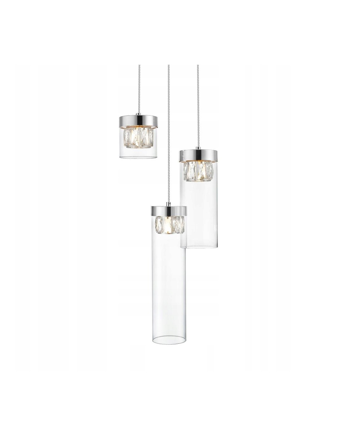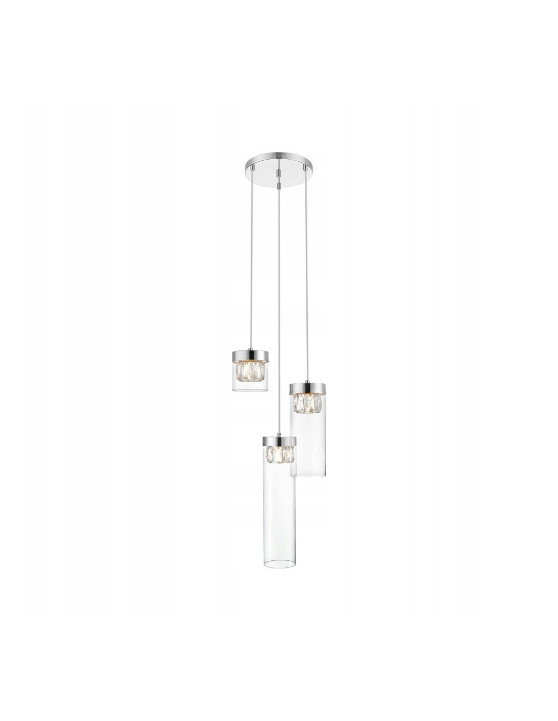 Unikalnym elementem lampy jest jej kaskadowa forma, która składa się z trzech przezroczystych kloszy zawieszonych na linkach o różnych długościach. Każdy klosz ma wykończenie w eleganckich odcieniach srebra i chromu, co nadaje lampie niezwykłego wdzięku i sprawia, że staje się ona centralnym punktem każdego pomieszczenia. Kryształki umieszczone w kloszach subtelnie rozpraszają światło, tworząc przytulną atmosferę.