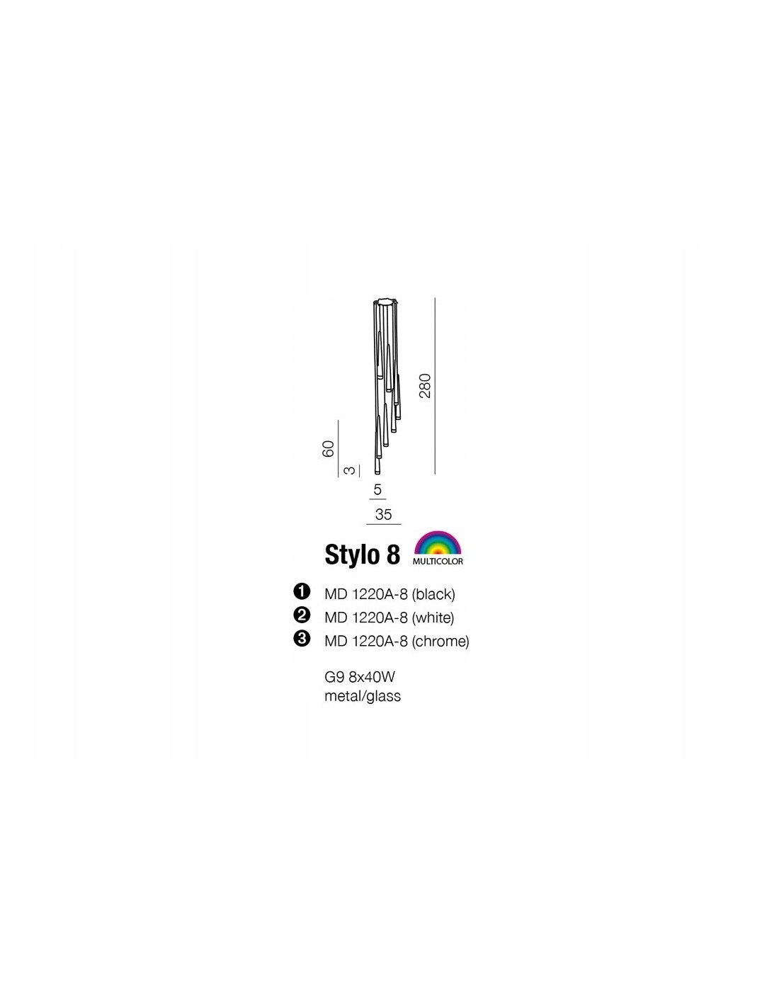 Jako źródło światła lampy został zastosowany gwint G9, co pozwala na stosowanie różnorodnych żarówek o maksymalnej mocy 40W. Lampa posiada osiem punktów świetlnych, co gwarantuje odpowiednie oświetlenie przestrzeni. Dzięki specyficznej konstrukcji, Stylo 8 nie rozprasza światła pod dużym kątem, lecz zapewnia punktowe i liniowe oświetlenie.