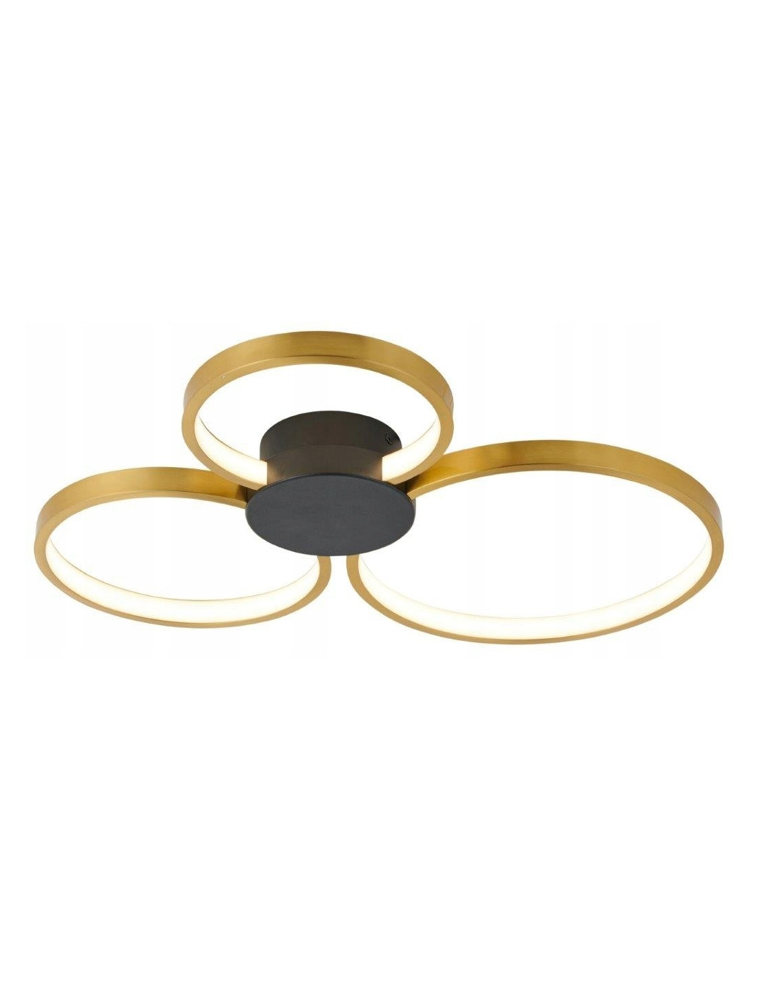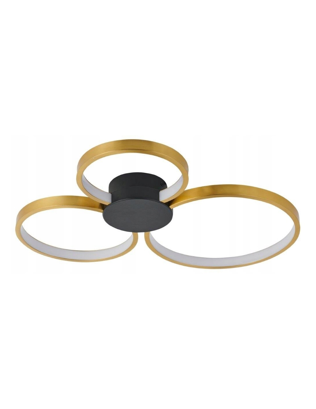 Przyglądając się bliżej, można dostrzec czarną, zewnętrzną ramę pierścieni oraz ich białą, wewnętrzną powierzchnię, co podkreśla źródło światła oraz tworzy efektowny kontrast. Taki układ nie tylko optycznie zwiększa przestrzeń, ale również wprowadza do pomieszczenia wyjątkowy charakter. Geometric shapes i połączenie czerni z złotem nadają lampie wyjątkowego, stylowego wyglądu.