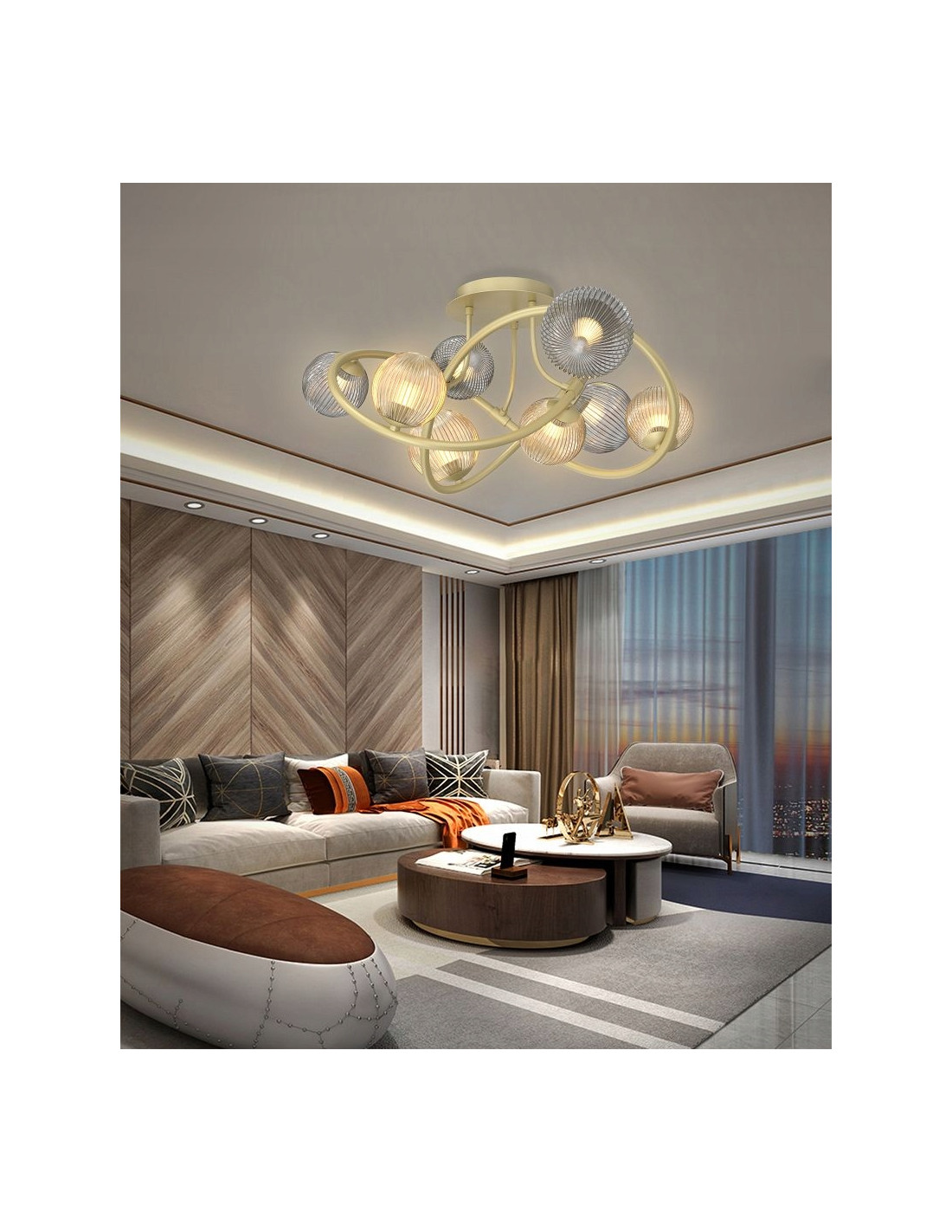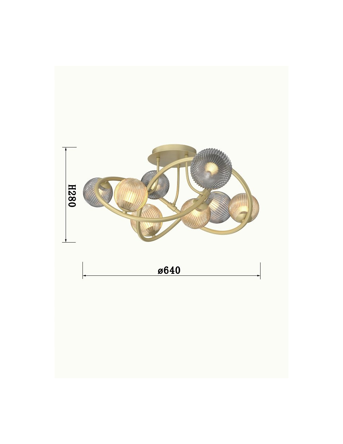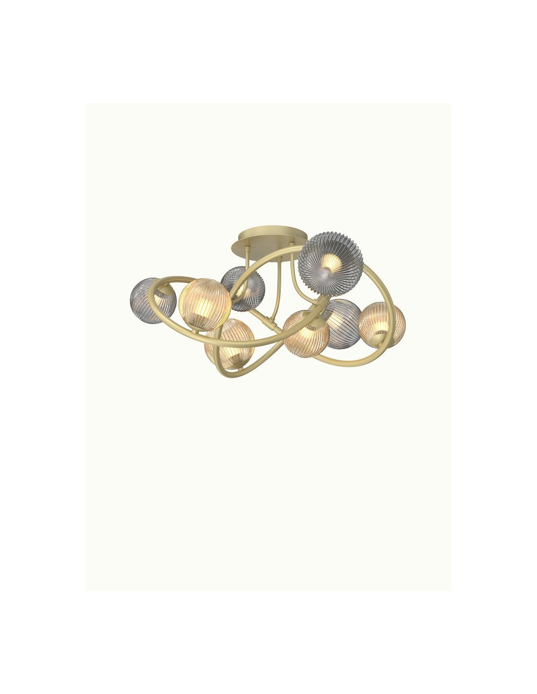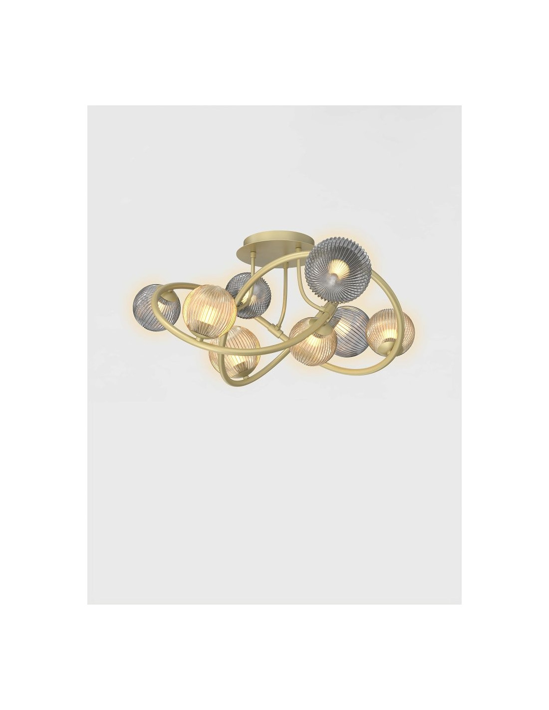 Wspaniały prążkowany wzór kloszy sprawia, że plafon staje się nie tylko źródłem światła, ale również elegancką dekoracją. Dzięki zastosowanej kolorystyce, w tym odcieniu złotym, lampa doskonale wpasuje się w różnorodne style aranżacyjne, od nowoczesnych po klasyczne. To doskonały przykład harmonijnego połączenia funkcjonalności z wysoką estetyką.