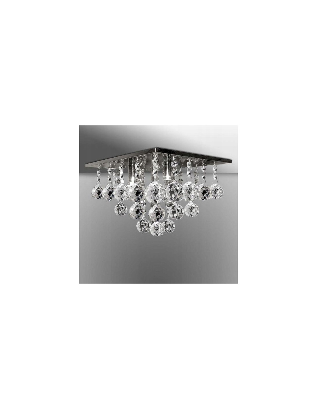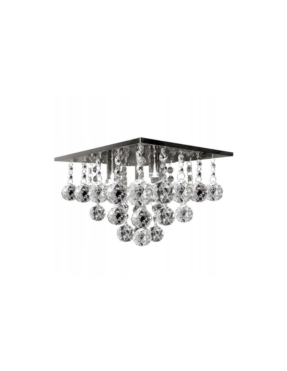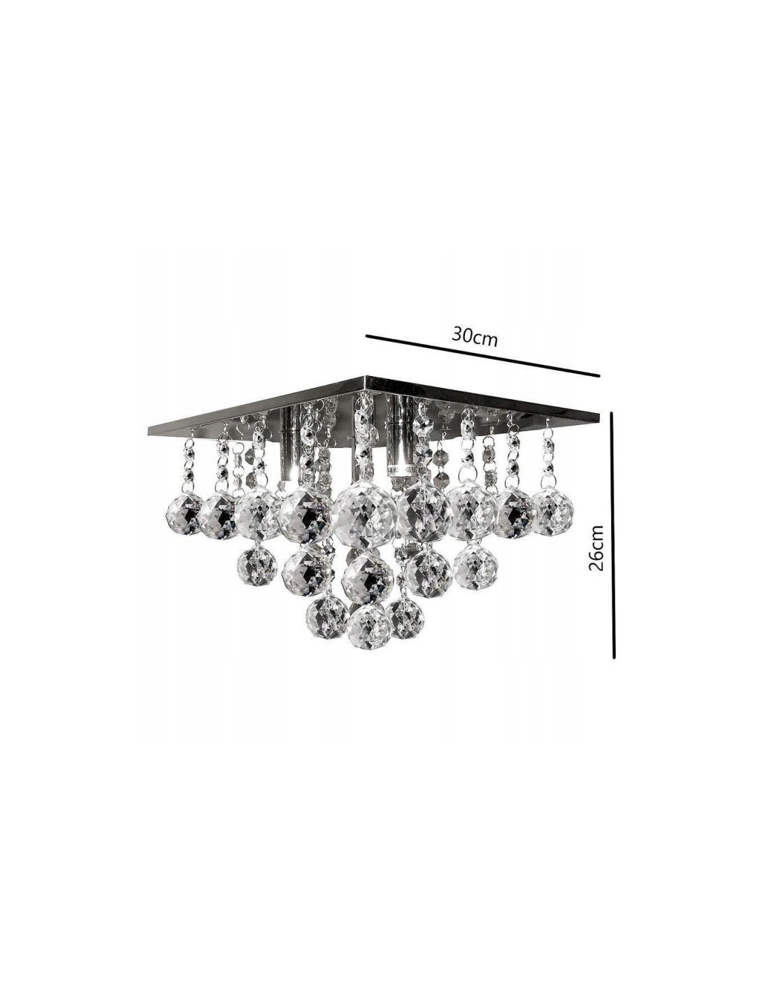 Plafon wykonany jest z wysokiej jakości materiałów, w tym przezroczystego kryształu oraz metalu w kolorze chromu. Jego kwadratowy kształt sprawia, że idealnie wkomponuje się w nowoczesne oraz klasyczne aranżacje wnętrz. Dodatkowo, model ten wyróżnia się wysokością 26 cm i szerokością 30 cm, co czyni go odpowiednim do różnych przestrzeni.