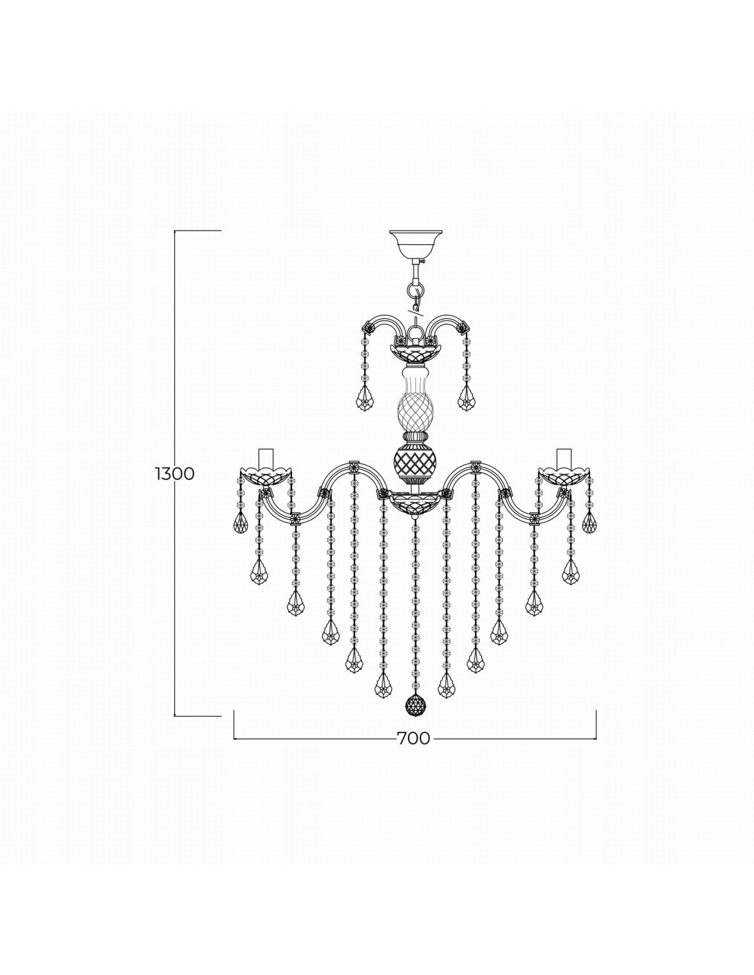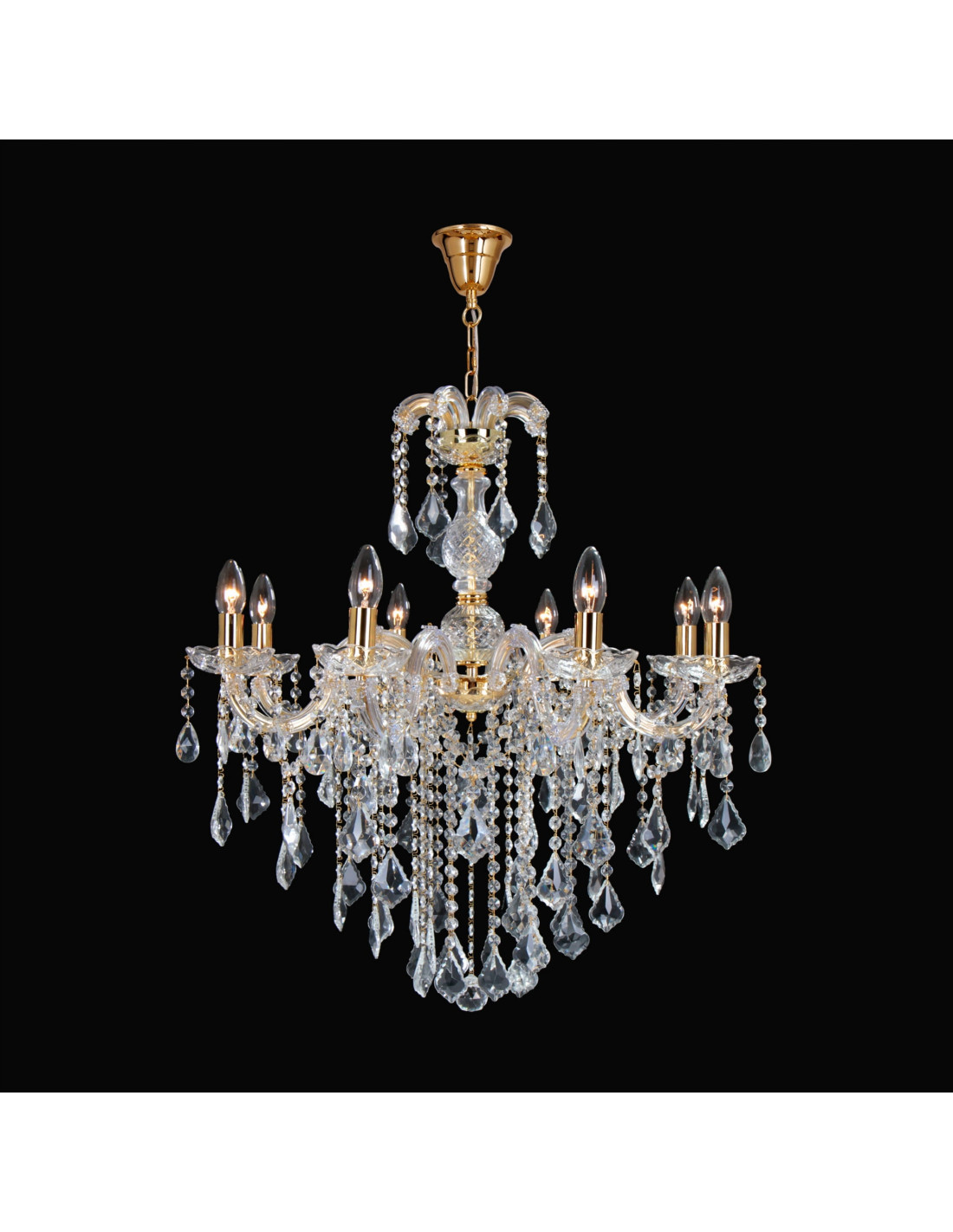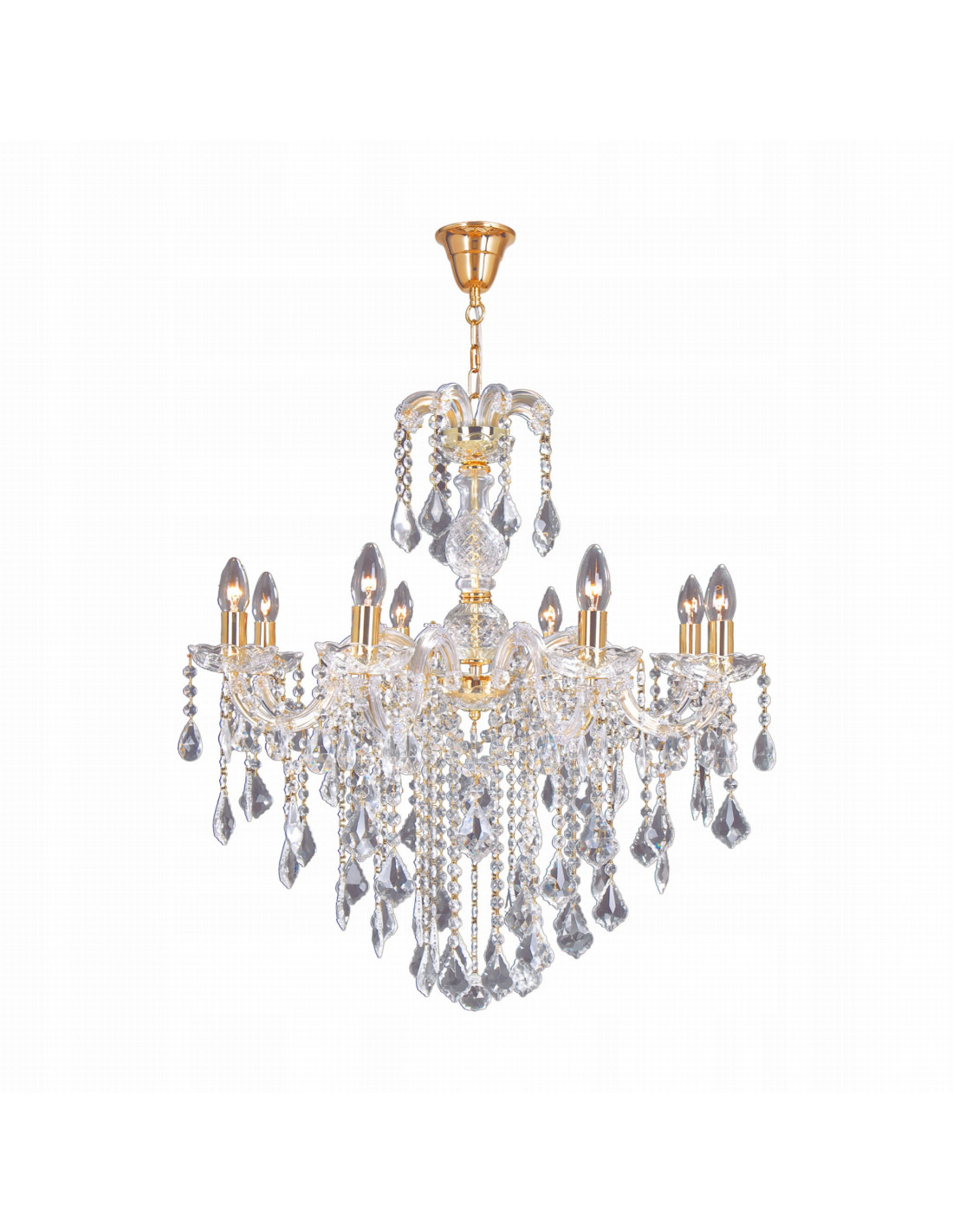 Dzięki złotemu wykończeniu i przezroczystym detalom, lampa nie tylko oświetla, ale także staje się prawdziwą dekoracją wnętrza. Osiem punktów świetlnych, które wykorzystują źródła światła E14, zapewnia wystarczającą moc oświetleniową, aby rozjaśnić nawet najbardziej przestronne pomieszczenia, tworząc zarazem ciepłą i przytulną atmosferę.