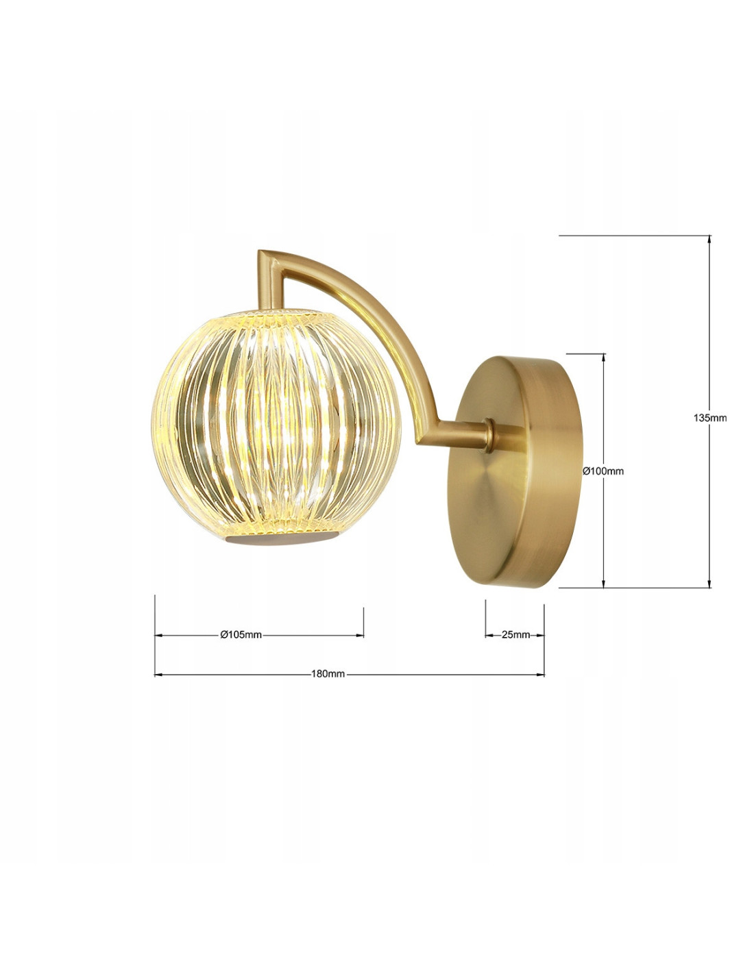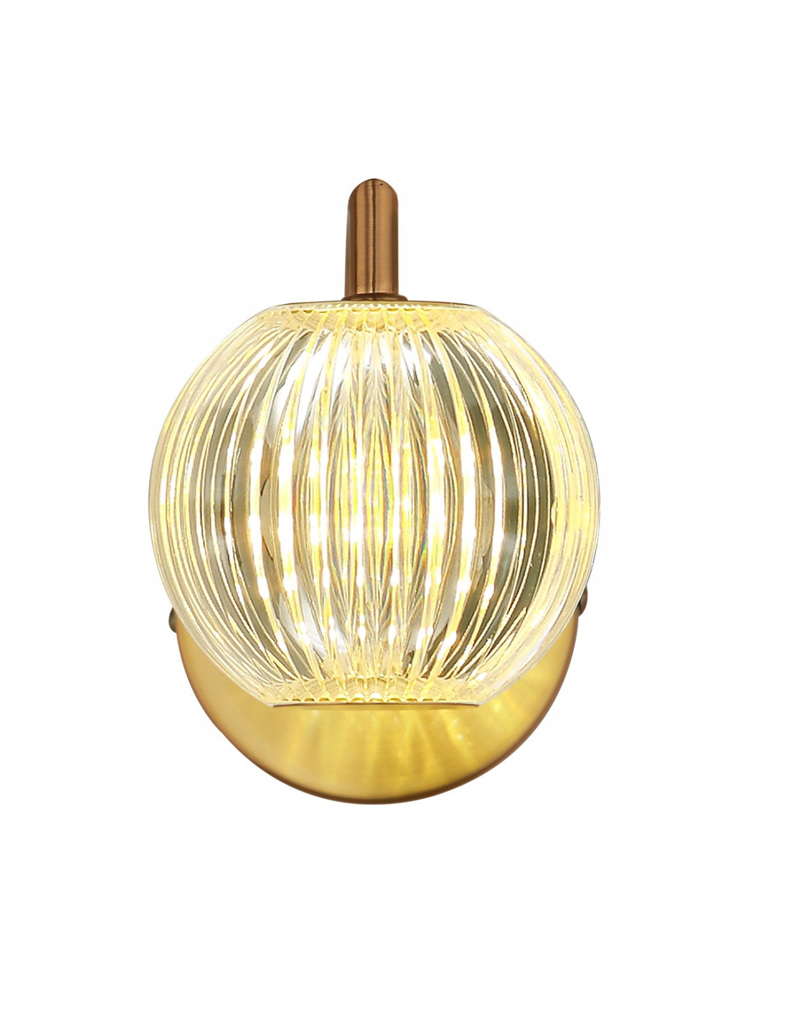 Klosz kinkietu wykonany jest z ciętego akrylu, co imituje kryształ i dodaje lekkości całej konstrukcji. Metalowa oprawa w złotym kolorze współgra z równie eleganckim kloszem, tworząc harmonijną całość. Wymiary kinkietu, wysokość 13,5 cm, szerokość 18 cm oraz średnica oprawy 10,5 cm, sprawiają, że jest on idealnym rozwiązaniem zarówno dla dużych, jak i mniejszych przestrzeni.