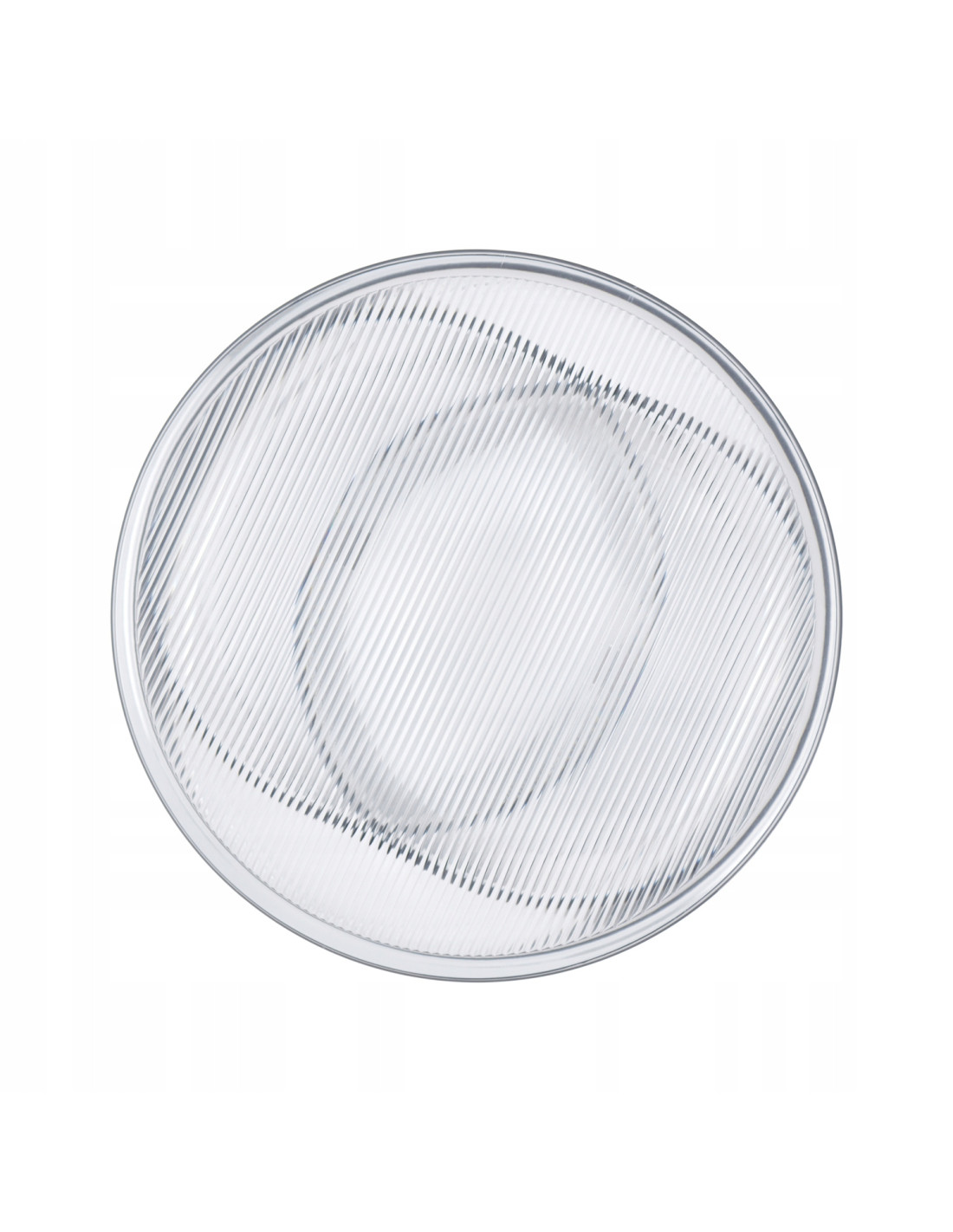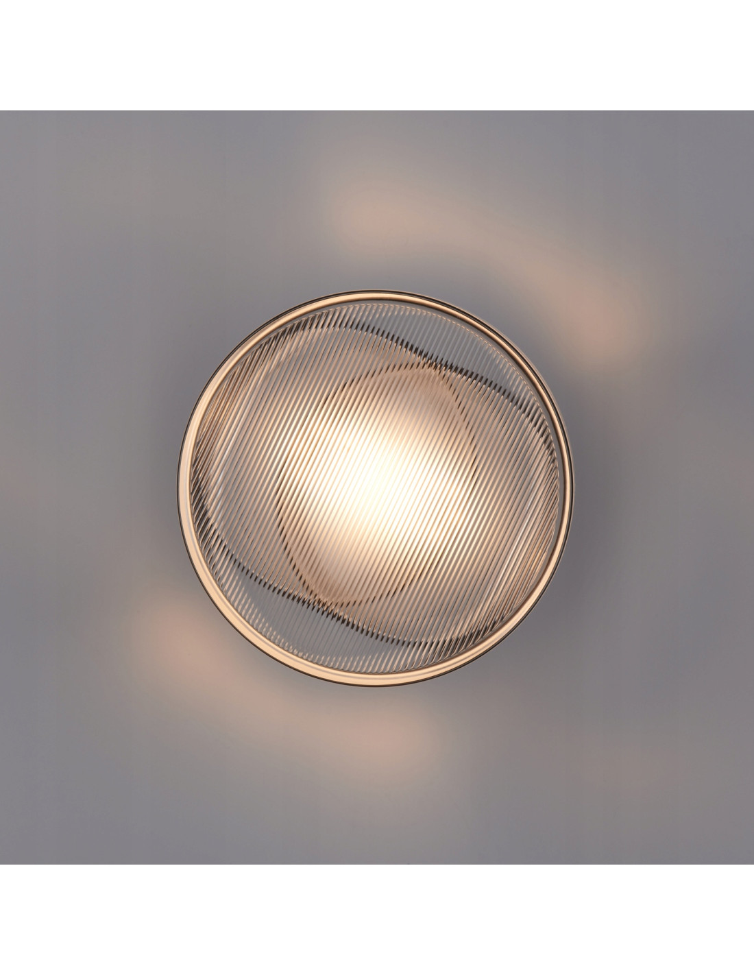Klosz kinkietu wykonany jest z przezroczystego akrylu, co pozwala na subtelne rozpraszanie światła. Jego powierzchnia jest pięknie fakturowana, z delikatnymi, pionowymi prążkami, które tworzą interesującą grę światła i cienia. Dodatkowo, gładki, matowy pas zdobiący krawędź klosza wprowadza do aranżacji subtelność i elegancję.