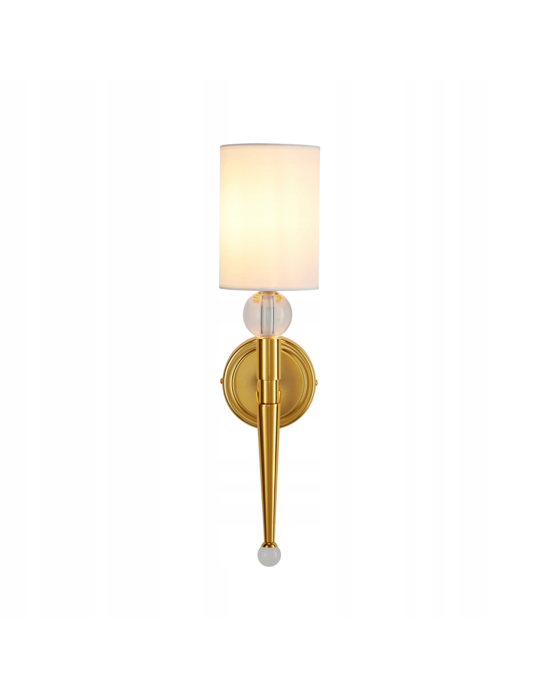 W kinkiecie znajdują się dwa dekoracyjne elementy w kształcie kuli, wykonane z przezroczystego kryształu. Kryształy te nie tylko odbijają światło, ale również dodają kinkietowi szykownego blasku. Każdy detal został starannie zaprojektowany, aby przyciągać uwagę i zachwycać swoim wyglądem.
