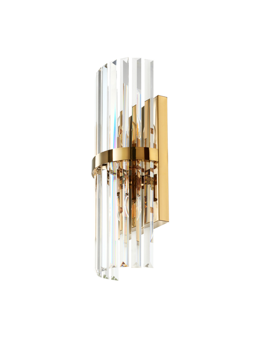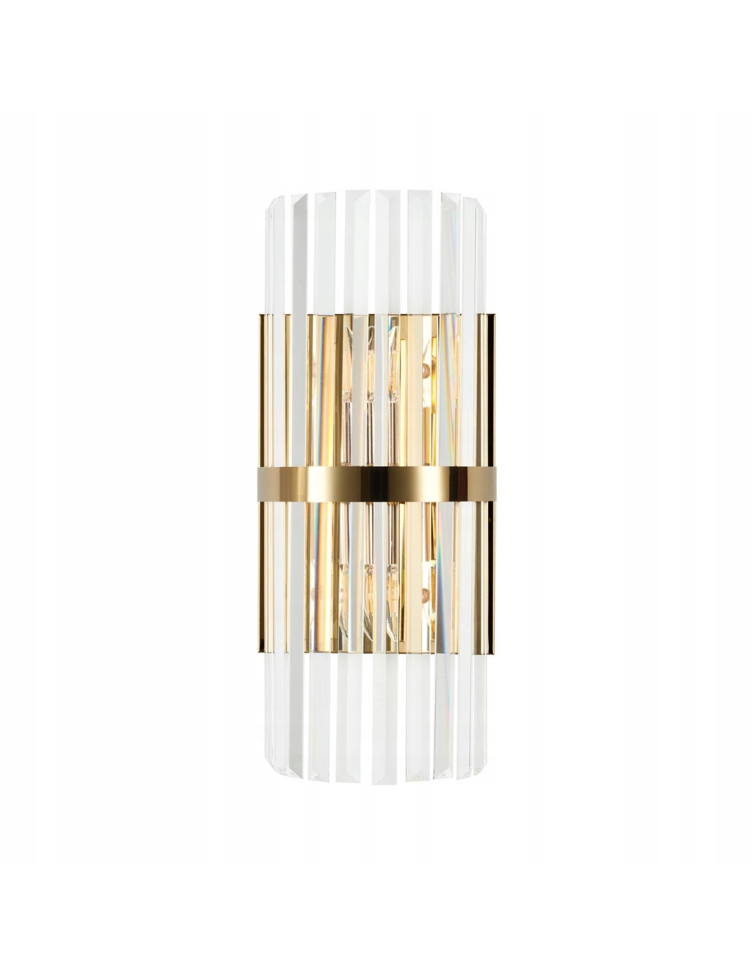 Projekt kinkietu bazuje na połączeniu złotych metalowych rurek przepasanych ozdobną złotą obręczą, która wyraźnie akcentuje formę i nadaje kompozycji elegancki wyraz. Delikatne kryształowe elementy rozpraszają światło, tworząc efektowną grę refleksów i subtelne rozświetlenie otoczenia. Całość prezentuje się zarówno dekoracyjnie, jak i funkcjonalnie.