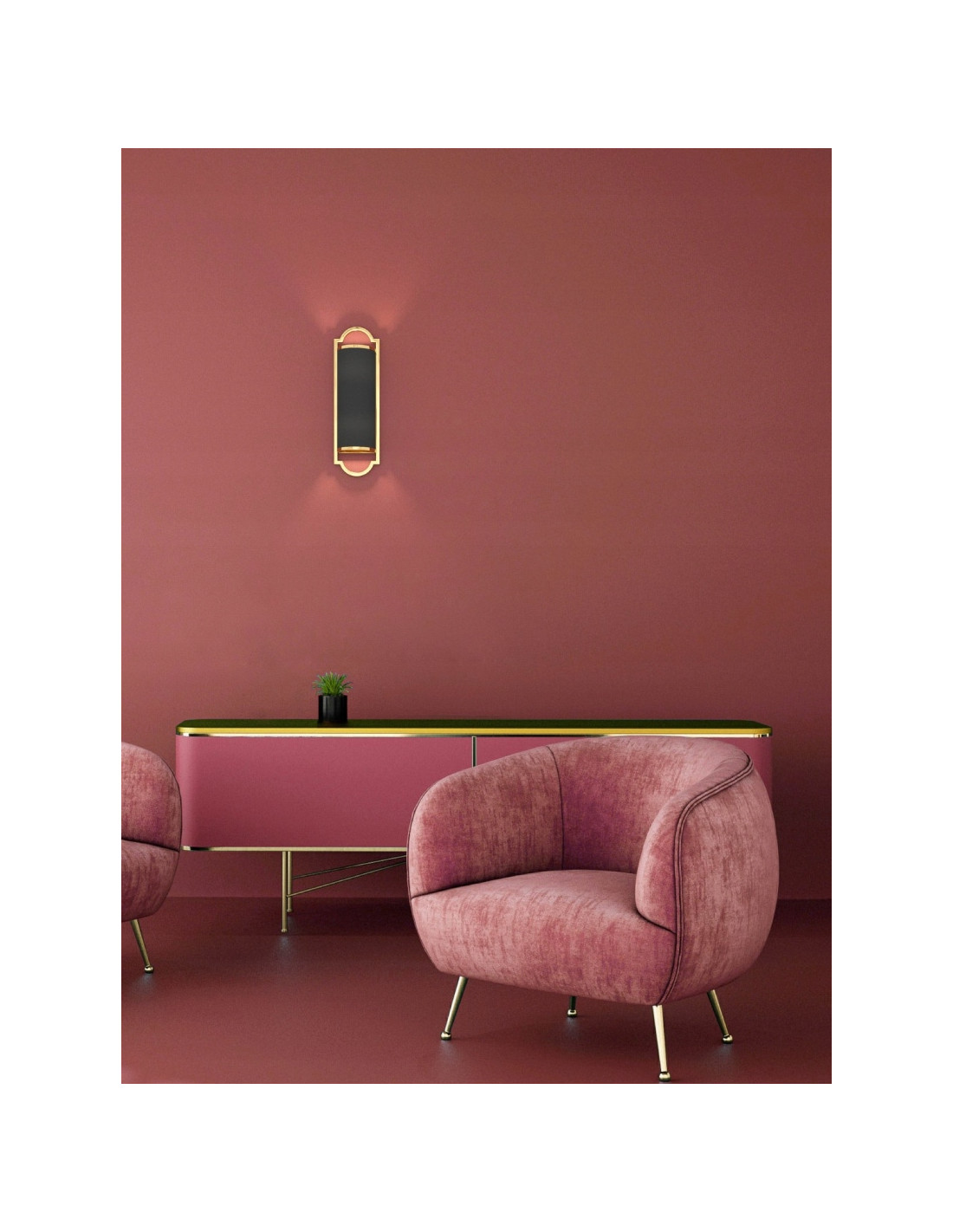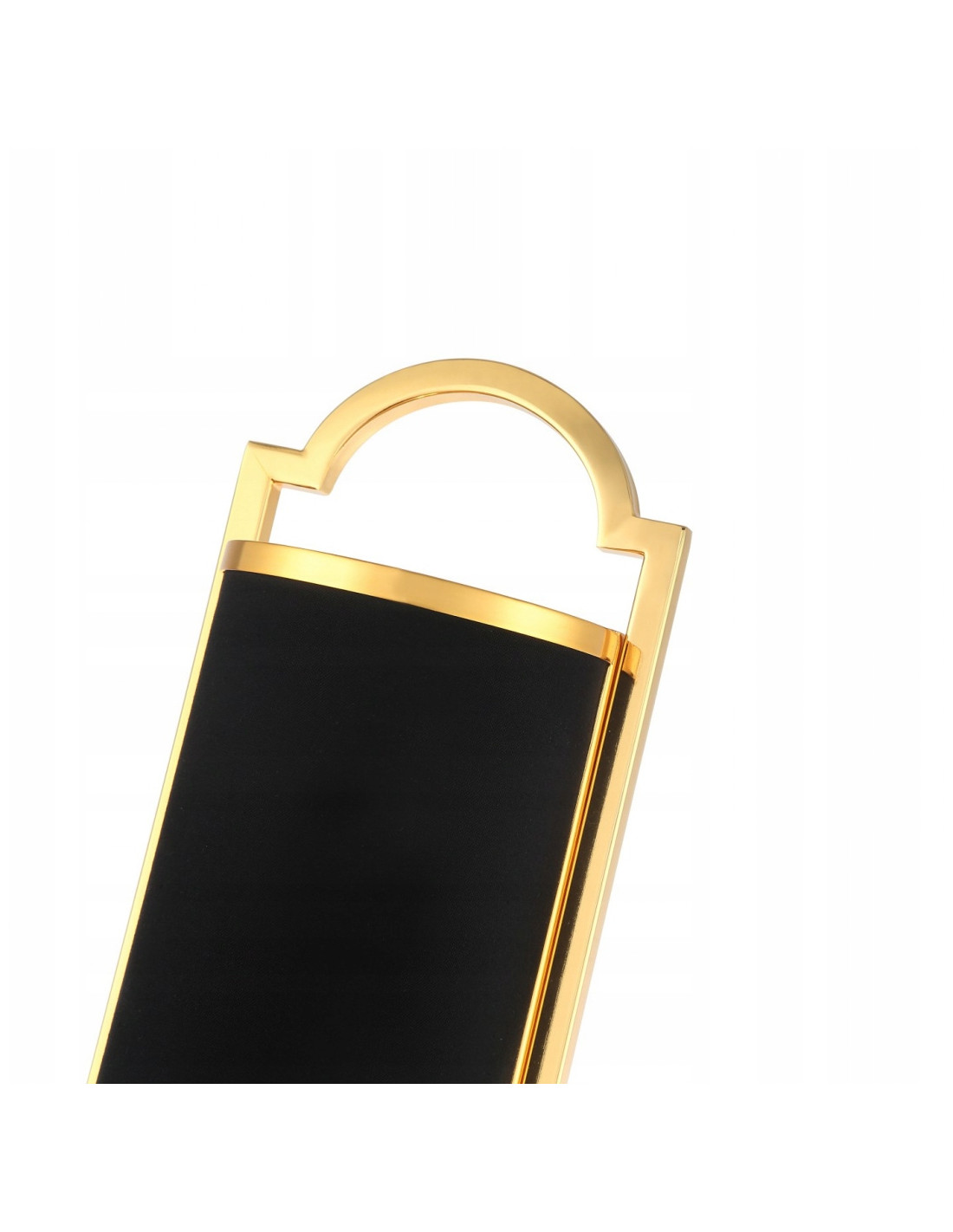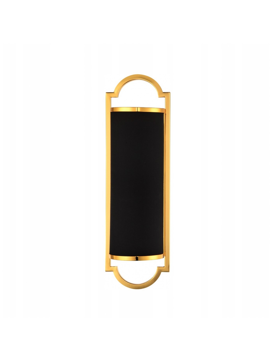 Wykonany z wysokiej jakości metalu w kolorze złotym, kinkiet zwraca uwagę również dzięki zastosowanej tkaninie w głębokim odcieniu czerni. Taki kontrast staje się znakomitym dopełnieniem wnętrz urządzonych w stylu nowoczesnym lub klasycznym. Model ten został zaprojektowany z myślą o miłośnikach designerskiego oświetlenia.