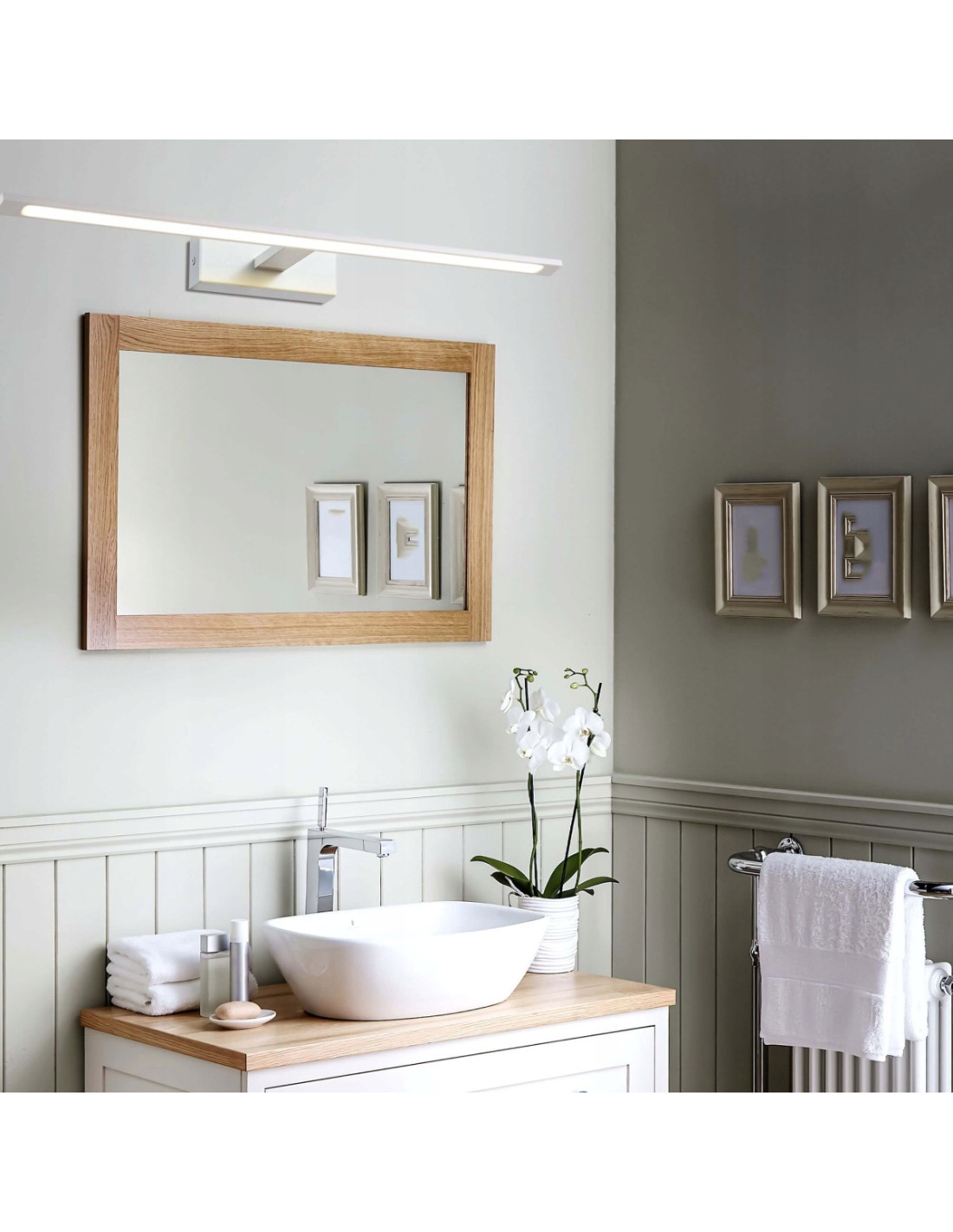 Dzięki swej minimalistycznej konstrukcji, kinkiet Isla w rozmiarze XXL, mierzący 5 cm wysokości i 96 cm szerokości, doskonale wkomponuje się w wysokie i przestronne pomieszczenia. Jego długi prostokątny kształt sprawia, że znajduje zastosowanie nad lustrem lub w innych istotnych punktach oświetleniowych w łazience. Mimo swojej prostoty, kinkiet ten stanowi efektowną dekorację, pasującą do różnorodnych stylów aranżacyjnych.