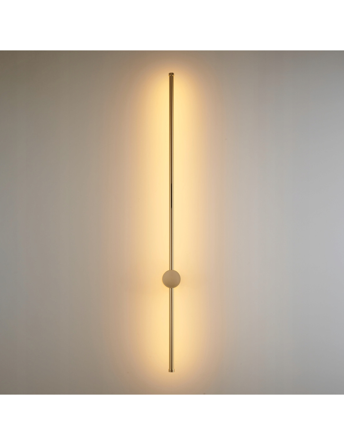 Kinkiet SPARO 120 cm to elegancka, liniowa oprawa ścienna zaprojektowana z myślą o wnętrzach hotelowych, salonach oraz nowoczesnych przestrzeniach komercyjnych. Smukła sylwetka o szerokości zaledwie 2 cm oraz wykończenie w kolorze złotego połysku umożliwiają dyskretną integrację z różnymi aranżacjami, dodając im jednocześnie subtelnego luksusu.