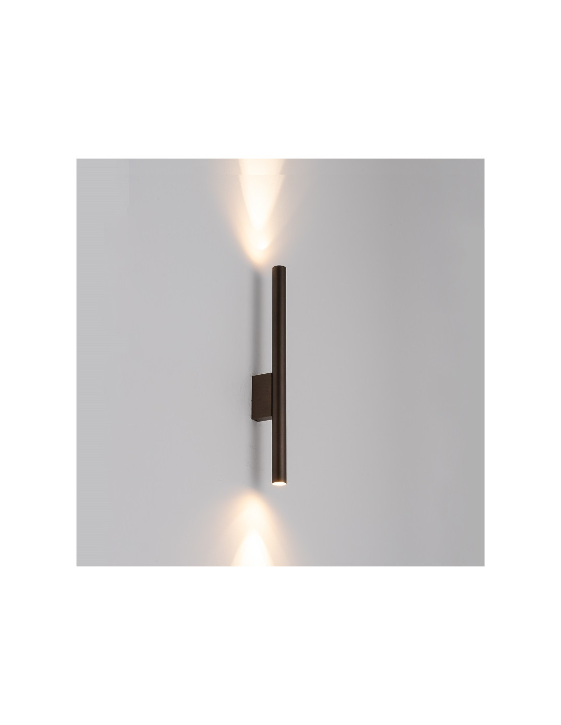 Obudowa kinkietu wykonana jest z wysokiej jakości metalu lakierowanego, co gwarantuje trwałość i łatwość utrzymania w czystości. Główny kolor to brązowy (czekoladowy), który w połączeniu z liniowym kształtem tworzy spójną formę idealną do wnętrz utrzymanych w stylu nowoczesnym i skandynawskim. Kinkiet ma wymiary: wysokość 40 cm, szerokość 2,5 cm oraz odstęp od ściany 6,5 cm.
