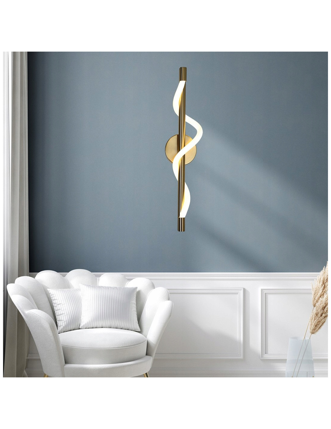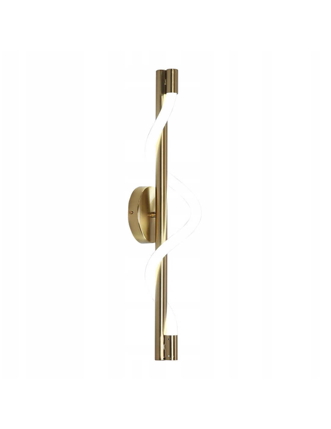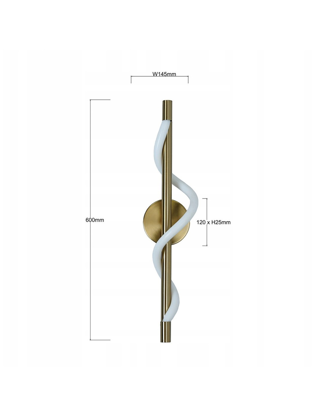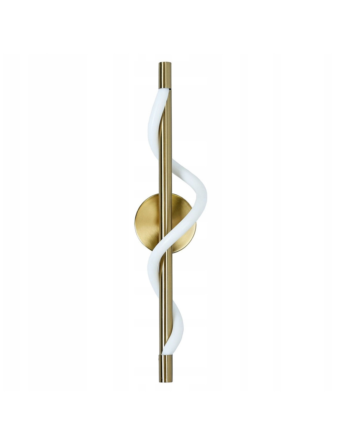 Stelaż kinkietu oraz okrągła podstawa zostały wykonane z metalowych elementów w szlachetnym złotym kolorze, co podkreśla jego nowoczesny wygląd. Klosz w kształcie spiralnie zwiniętej tuby został stworzony z elastycznego akrylu, co czyni go nie tylko estetycznym, ale także funkcjonalnym. Wnętrze klosza zawiera zintegrowane źródło światła LED o regulowanej barwie (CCT), dzięki czemu użytkownik ma możliwość dostosowania temperatury światła do swoich indywidualnych potrzeb.