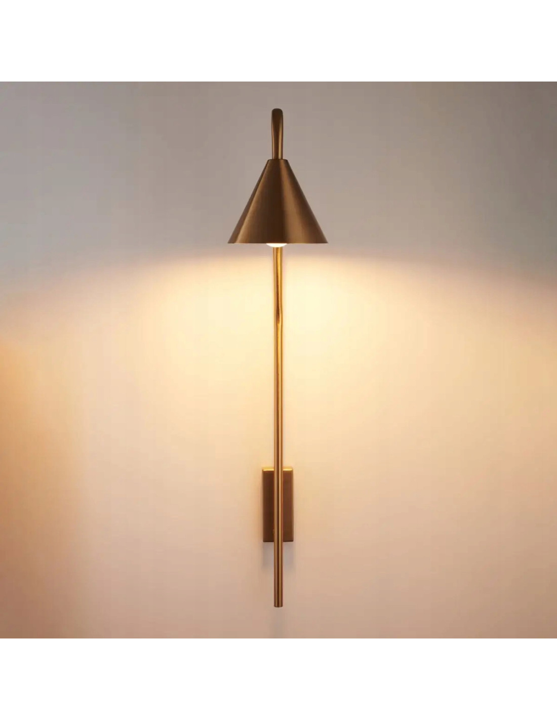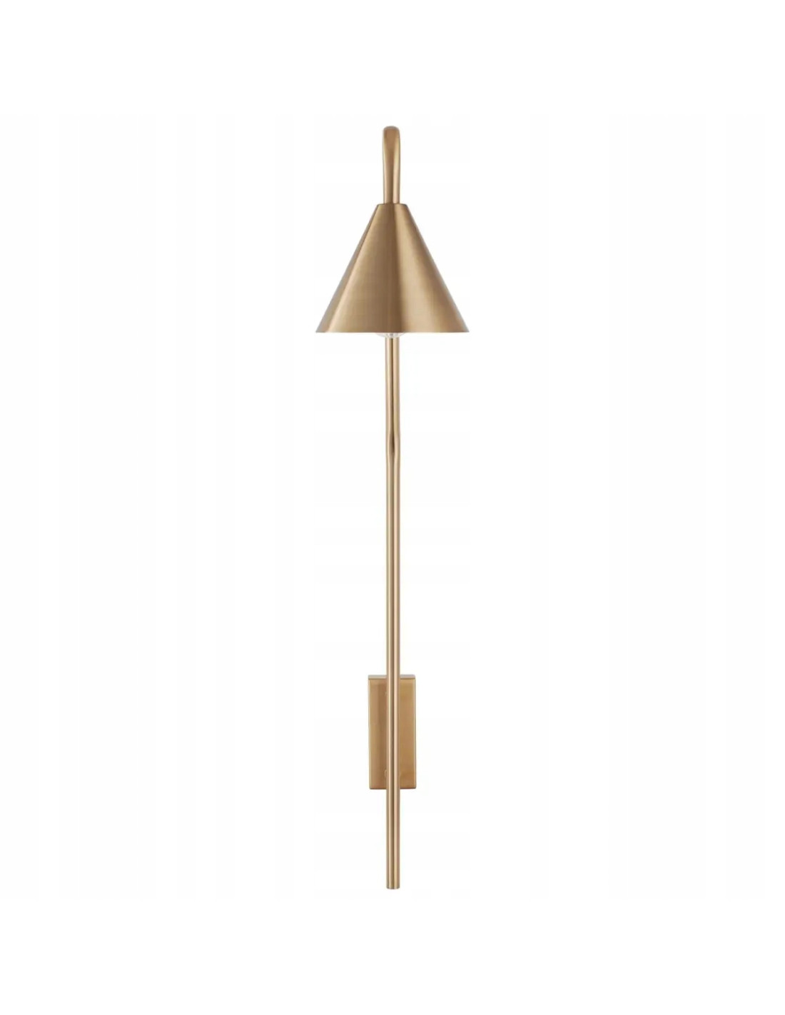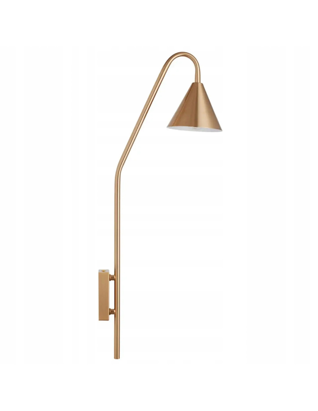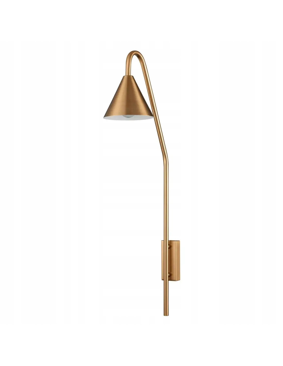 Ten kinkiet charakteryzuje się kształtem ściętego stożka, który skierowany jest w dół, co zapewnia optymalne oświetlenie. Osadzony na pionowym uchwycie ściennym, wykonanym z metalu w kolorze złotym, prezentuje się niezwykle efektownie. Wewnętrzna strona klosza jest biała, co zapewnia doskonałe odbicie światła, a tym samym efektywne oświetlenie pomieszczenia.