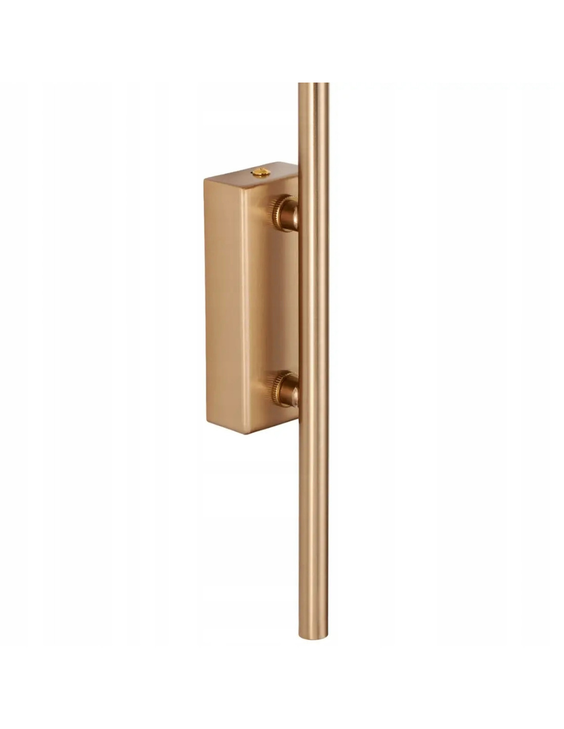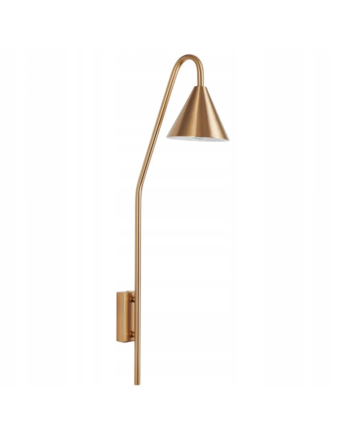 Długie, smukłe ramię kinkietu, również wykonane z metalu w złotym kolorze, dodaje mu lekkości i nowoczesności. Odpowiednio zaprojektowane, nie tylko umożliwia łatwe dopasowanie lampy na ścianie, ale także optymalizuje okolice źródła światła. Minimalistyczne, prostokątne mocowanie do ściany stanowi subtelne uzupełnienie całości, podkreślając industrialny charakter lampy.