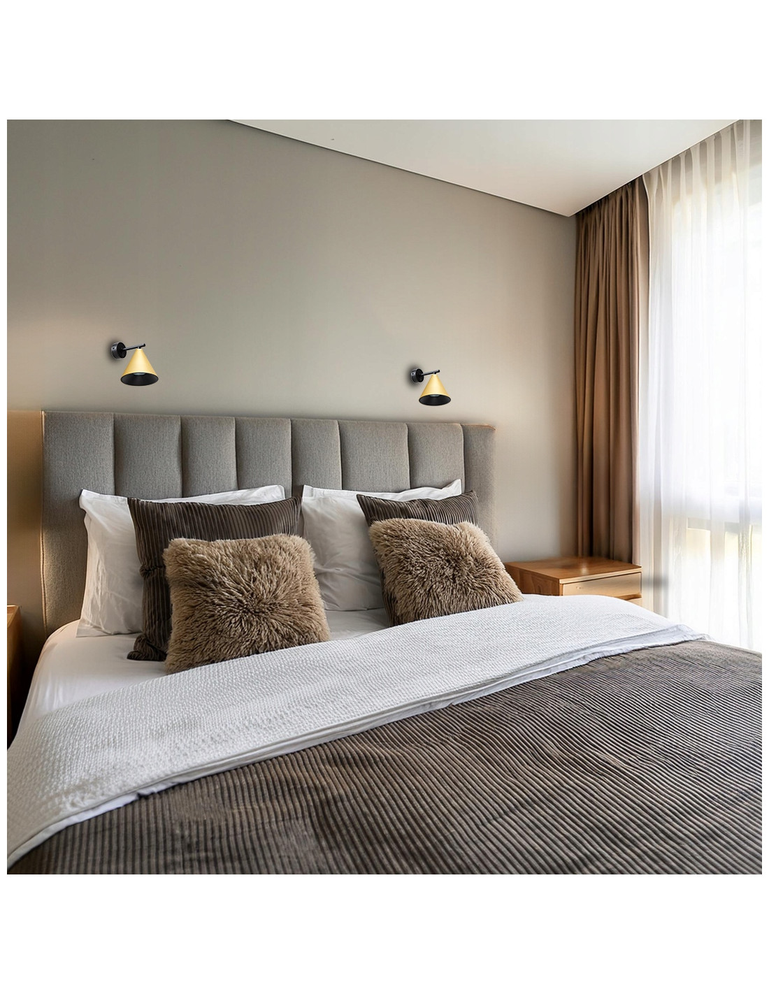 Odkryj elegancję i nowoczesność z kinkietem Złoty kinkiet na wysięgniku Cone, stworzonym z myślą o stylowych wnętrzach. Ta wyjątkowa lampa idealnie sprawdzi się nad łóżkiem w sypialni, dodając pomieszczeniu niepowtarzalnego charakteru. Dzięki swojej unikalnej konstrukcji oraz zastosowaniu wysokiej jakości materiałów, kinkiet ten łączy w sobie estetykę i funkcjonalność.