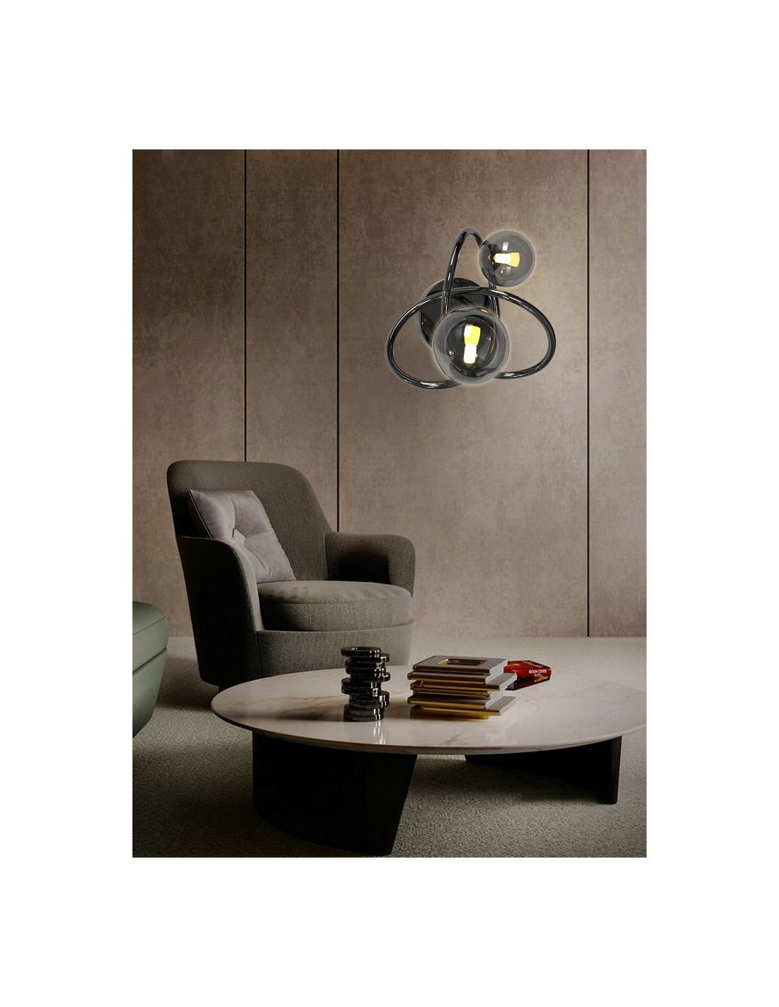 Jej piękny kolor czarnego chromu doskonale wpasuje się w każde pomieszczenie, a dymione klosze dodają uroku, subtelnie rozpraszając światło i tworząc przytulną atmosferę. Kinkiet ten jest idealny zarówno do sypialni, jak i do salonu, biura czy korytarza.