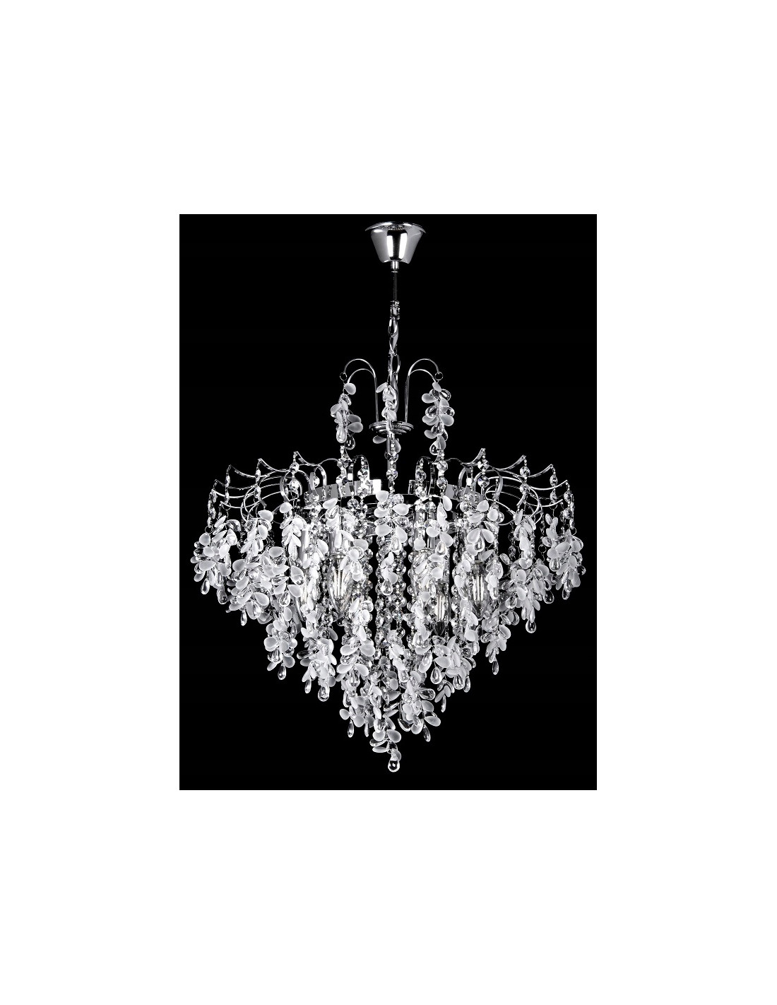 Ta lampa jest dostępna w dwóch eleganckich kolorach: chrom i ciemne złoto, co sprawia, że łatwo ją dopasować do wielu stylów dekoracyjnych. Dzięki możliwości instalacji sześciu niezależnych żarówek z gwintem E14, lampa dostarcza intensywne i efektywne oświetlenie, idealne do dużych pomieszczeń. Jej konstrukcja umożliwia efektywne rozpraszanie światła, które przyciąga wzrok i podkreśla piękno kryształowych detali.