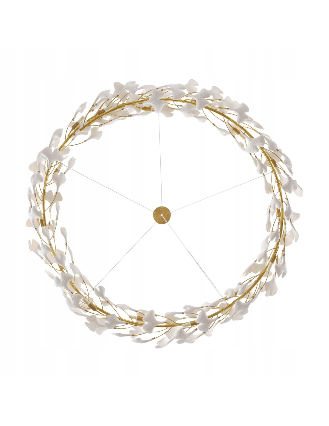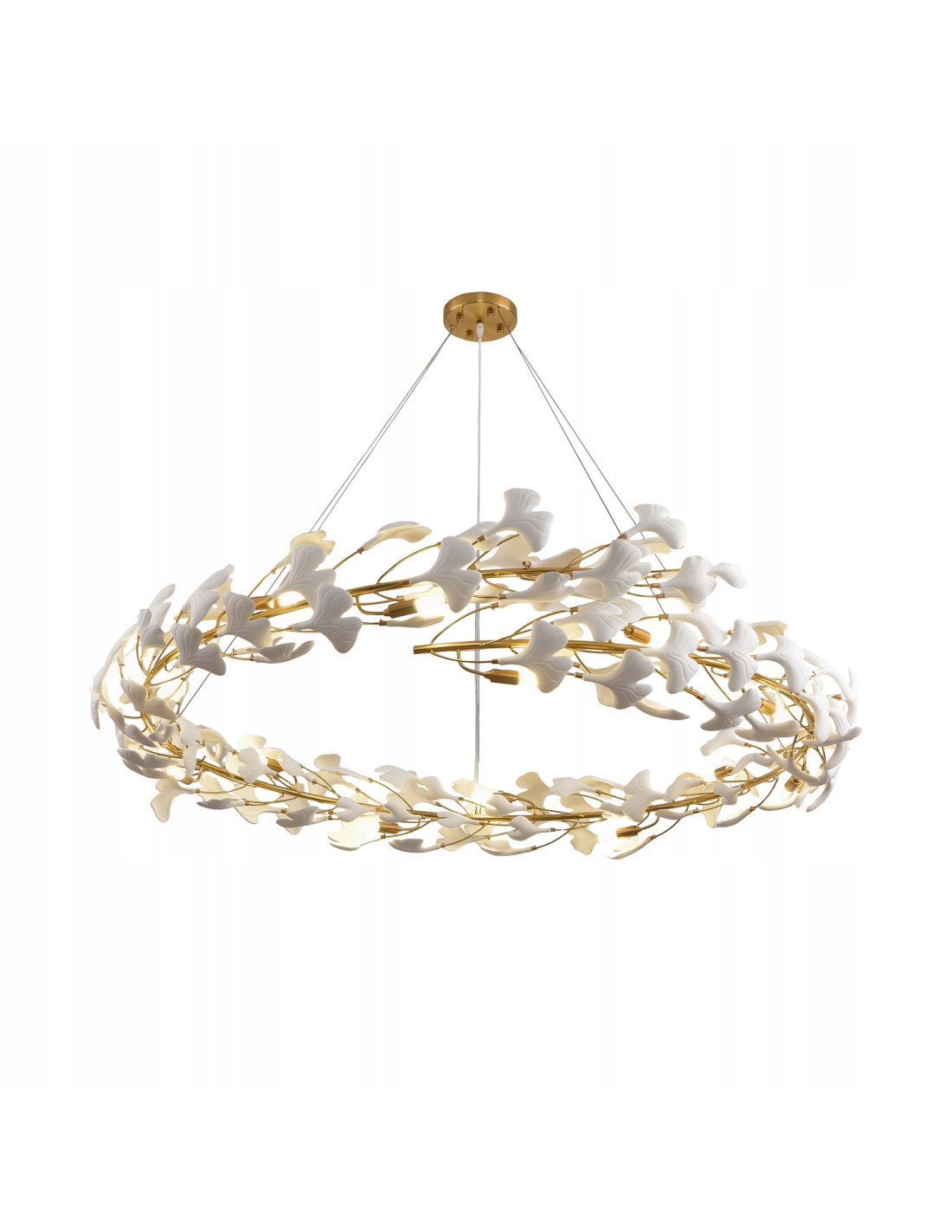 Duża ceramiczna lampa ze złotą ramą listki 150cm to pełna elegancji i stylu lampa, która z pewnością stanie się centralnym punktem w każdym wnętrzu. Jej niepowtarzalny design inspirowany jest naturalnym pięknem liści Ginkgo, które jako symbol długowieczności i piękna, nadaje lampie unikalnego charakteru. Zastosowanie matowej, białej ceramiki w połączeniu z lśniącym złotym stelażem tworzy harmonijną całość, wpisującą się w nowoczesne trendy aranżacji.