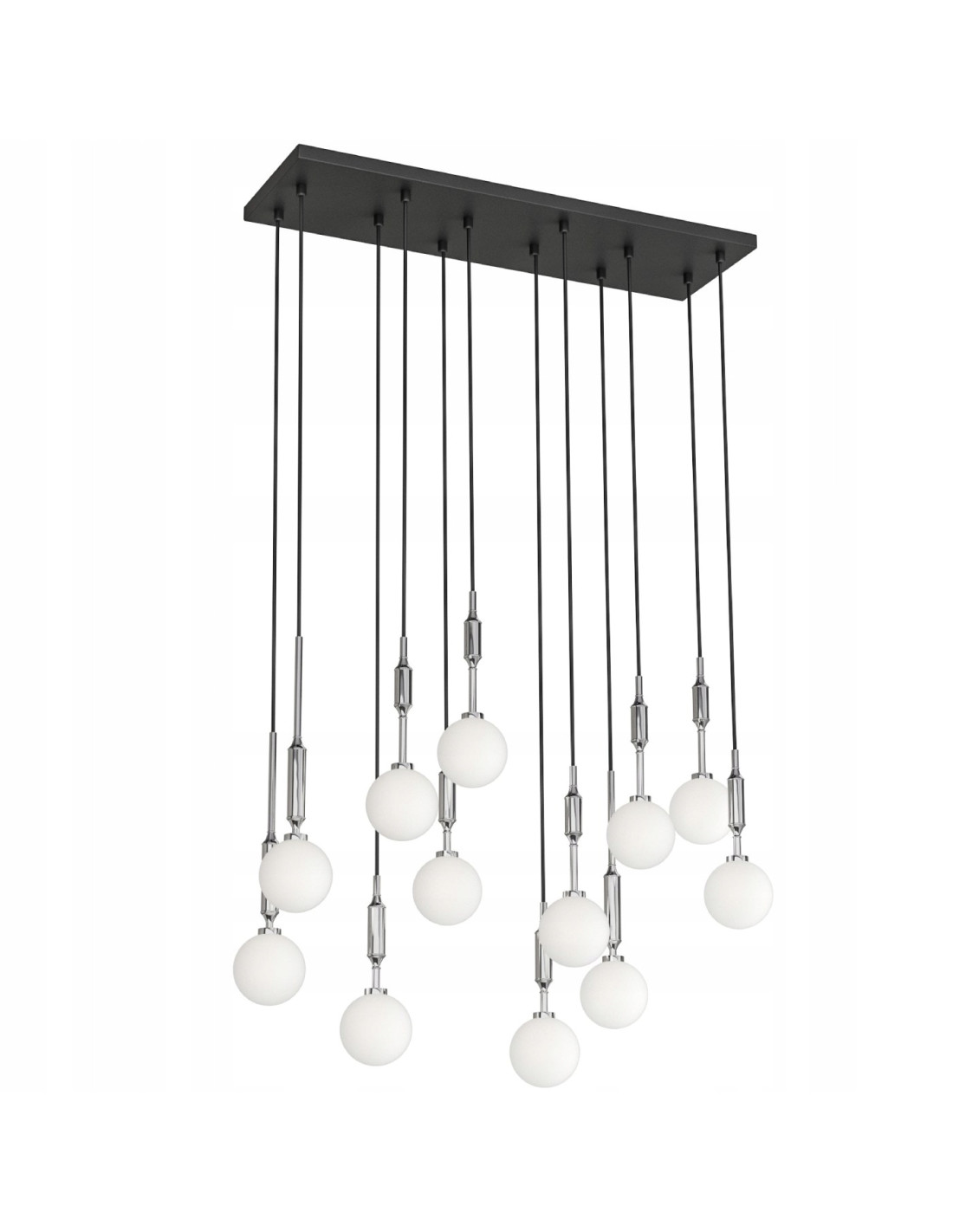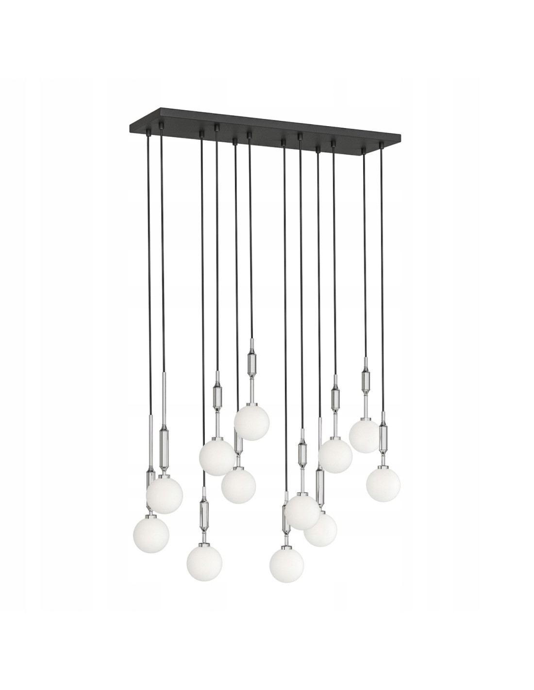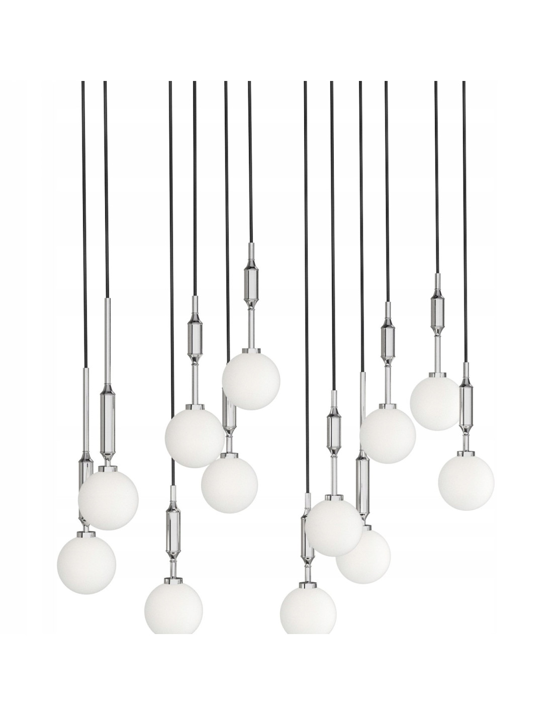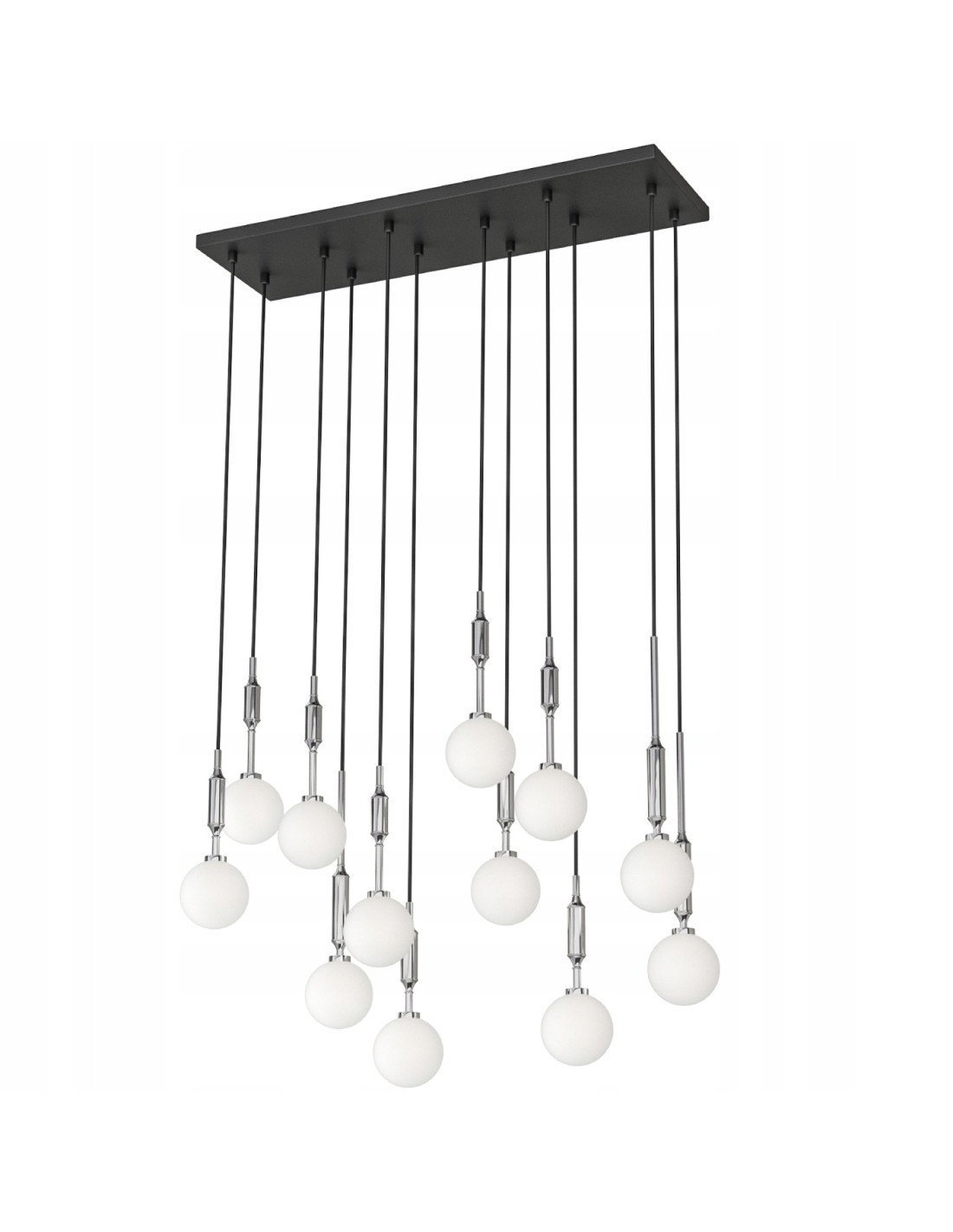 Rewelacyjna lampa sufitowa Ero XII Cromo 80×25 to doskonały wybór dla wszystkich, którzy cenią sobie elegancki minimalizm. Jej nowoczesny design sprawia, że świetnie wpisuje się w różnorodne aranżacje wnętrz, wprowadzając do nich wyjątkowy klimat. Czternaście mlecznych kul zawieszonych na smukłych, czarnych przewodach tworzy efektowną kompozycję, która nadaje przestrzeni lekkości i stylu.
