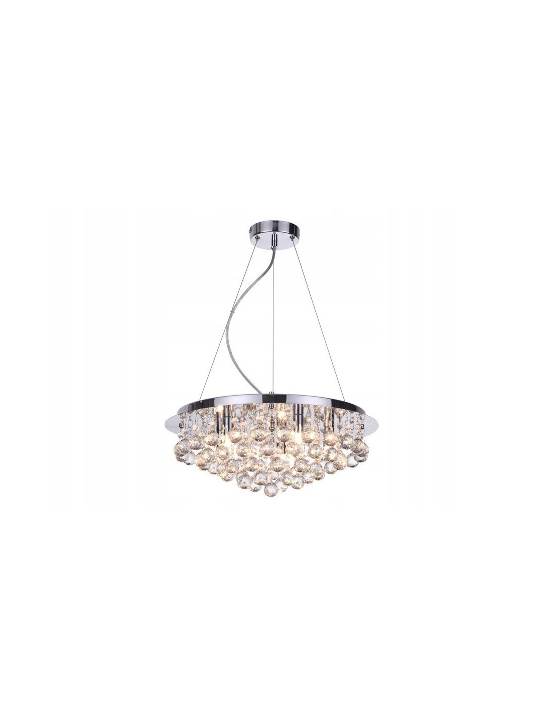 Lampa w stylu glamour LOONA to doskonałe połączenie elegancji i nowoczesności, które doda blasku każdemu wnętrzu. Jej chromowane wykończenie oraz okrągłe kryształy przyciągają wzrok, tworząc efektowną kompozycję świetlną, idealną do ekspozycji w centralnej części pomieszczenia. Dzięki pięciu wyjątkowym kloszom umieszczonym na różnych wysokościach, lampa emanuje niepowtarzalnym urokiem.