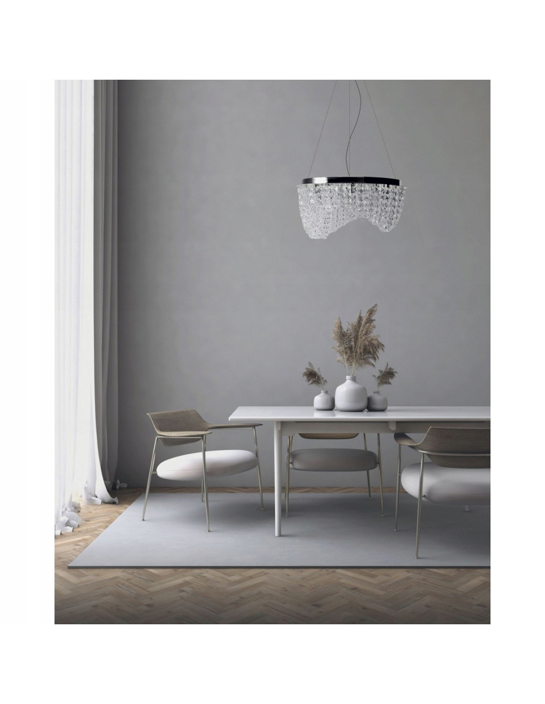 Produkcja lampy CARMEN wykorzystuje wysokiej jakości materiały, takie jak metal i kryształ, co sprawia, że produkt jest nie tylko estetyczny, ale również trwały. Jej chromowany kolor w połączeniu z kryształowymi akcentami wprowadza do wnętrza niezwykły blask i elegancję. Klosz o średnicy 53 cm oraz wysokości 120 cm sprawiają, że lampa idealnie wpasowuje się w różnorodne aranżacje, od nowoczesnych po bardziej klasyczne.
