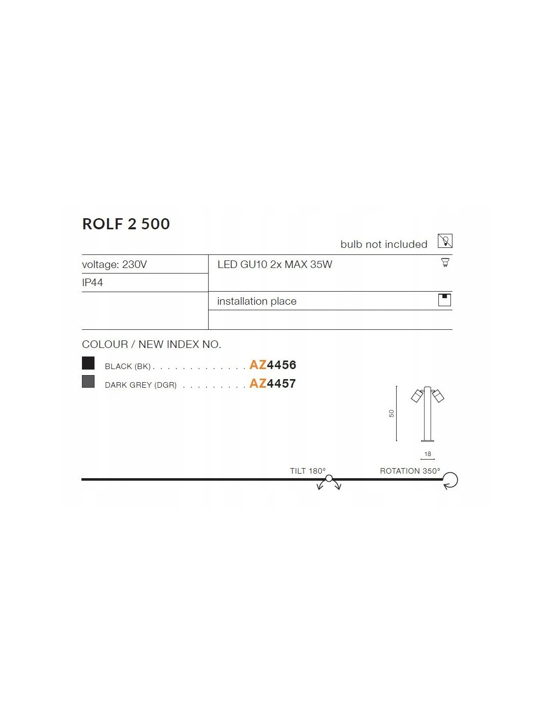 W lampie ROLF 2 zastosowano gwint GU10, który pozwala na łatwe wymienienie źródła światła. Maksymalna moc żarówki wynosi 35 W, co gwarantuje efektywne oświetlenie przy jednoczesnym zachowaniu wysokiej efektywności energetycznej klasy A. Dodatkowym atutem jest możliwość regulacji padania światła, co pozwala na dostosowanie oświetlenia do różnych potrzeb i sytuacji.