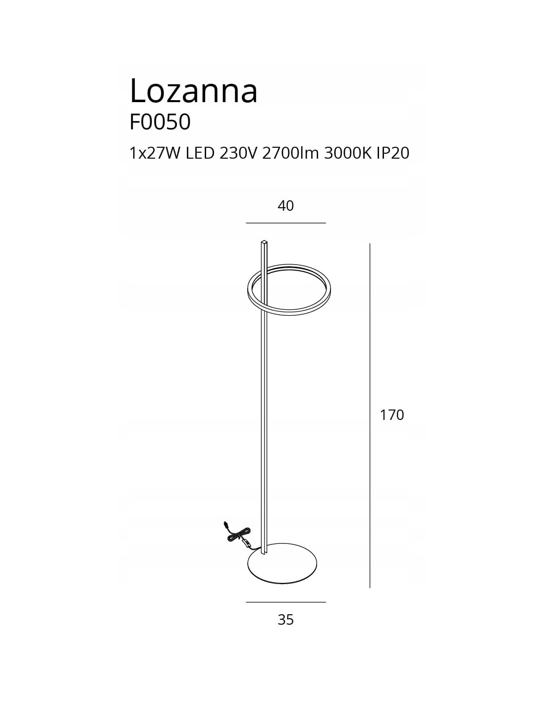 Specyfikacja techniczna lampy Lozanna prezentuje się imponująco. Wysokość lampy wynosi 170 cm, co czyni ją idealnym dodatkiem do wysokich pomieszczeń. Jej średnica wynosząca 40 cm sprawia, że lampa zachowuje równowagę w przestrzeni, a także doskonale skupia światło, które wydobywa się z 27-watowego źródła LED. Barwa światła to 3000K, zapewniając przyjemne, ciepłe oświetlenie.
