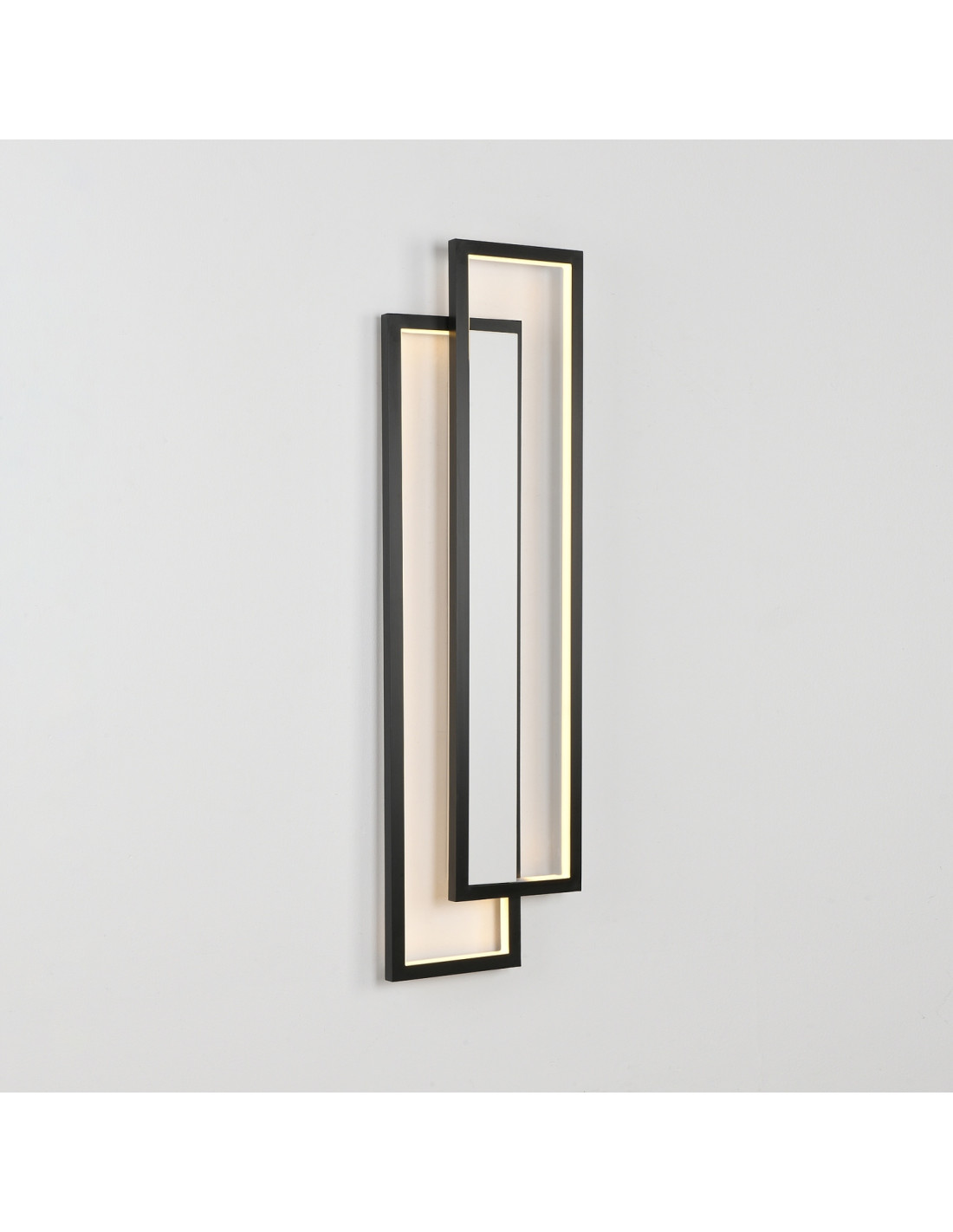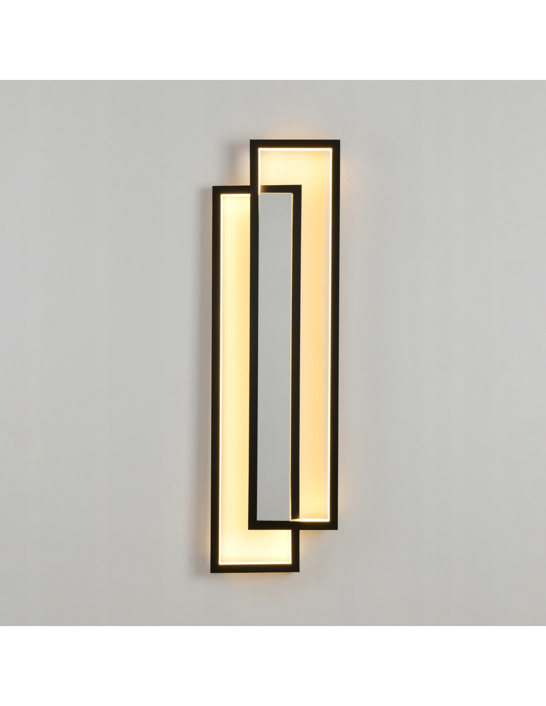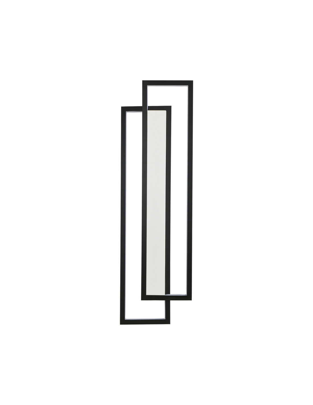Struktura lampy składa się z dwóch długich, wąskich prostokątów, które są usytuowane obok siebie, tworząc wyraźne geometryczne kształty. Wykonana z metalu, kinkiet charakteryzuje się czarną ramą zestawioną z białym wypełnieniem, co podkreśla jej nowoczesny i elegancki wygląd. Taki kontrast idealnie wpisuje się w współczesne wnętrza, nadając im wyjątkowego charakteru.