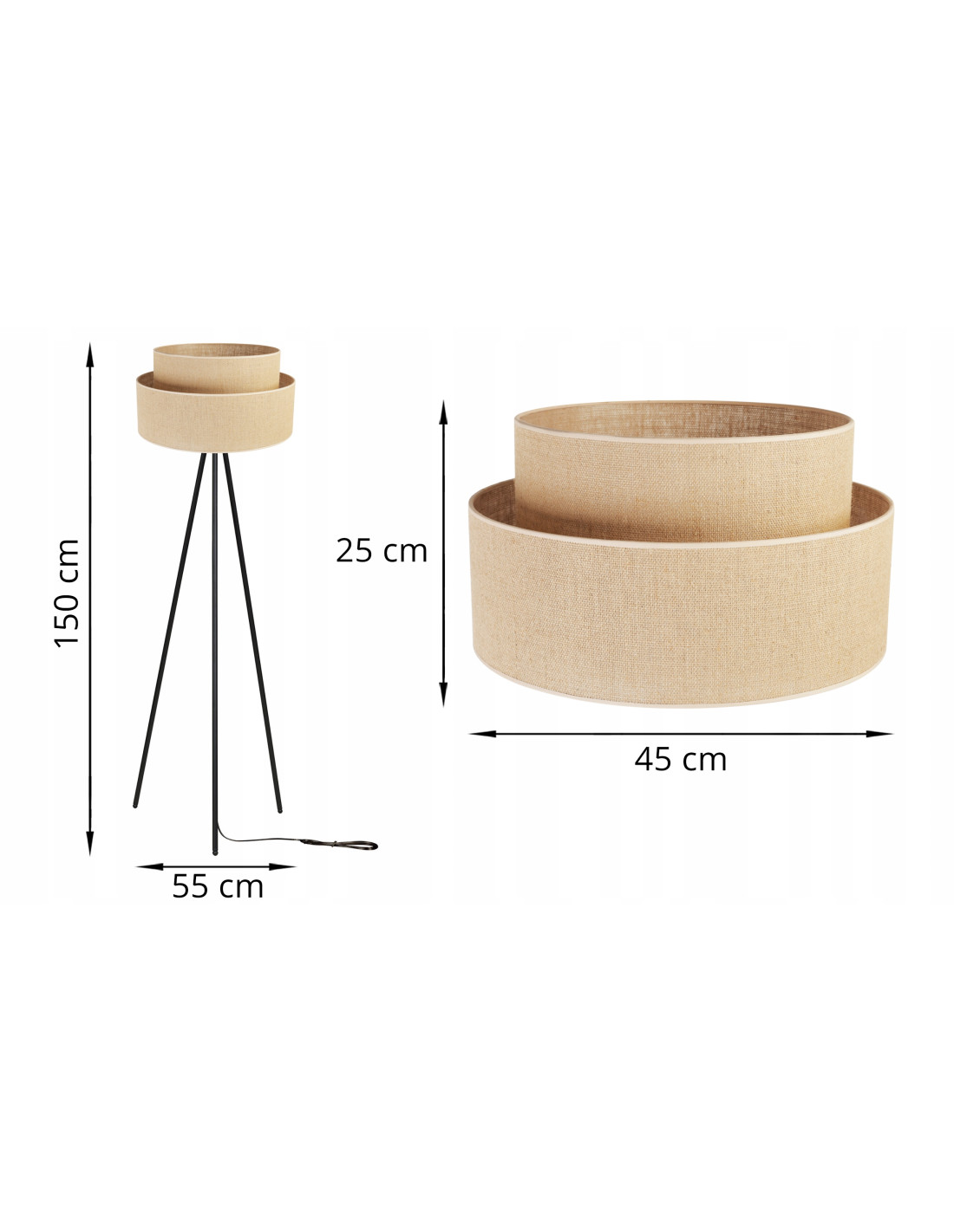 Wymiary lampy zostały starannie zaprojektowane, aby harmonijnie komponowały się z różnorodnymi stylami aranżacyjnymi. Wysokość z abażurem wynosi 150 cm, a szerokość to 55 cm, co sprawia, że doskonale nadaje się zarówno do małych, jak i dużych przestrzeni. Klosz o średnicy 45 cm i wysokości 25 cm efektownie rozprasza światło, co dopełnia charakter każdego pomieszczenia.