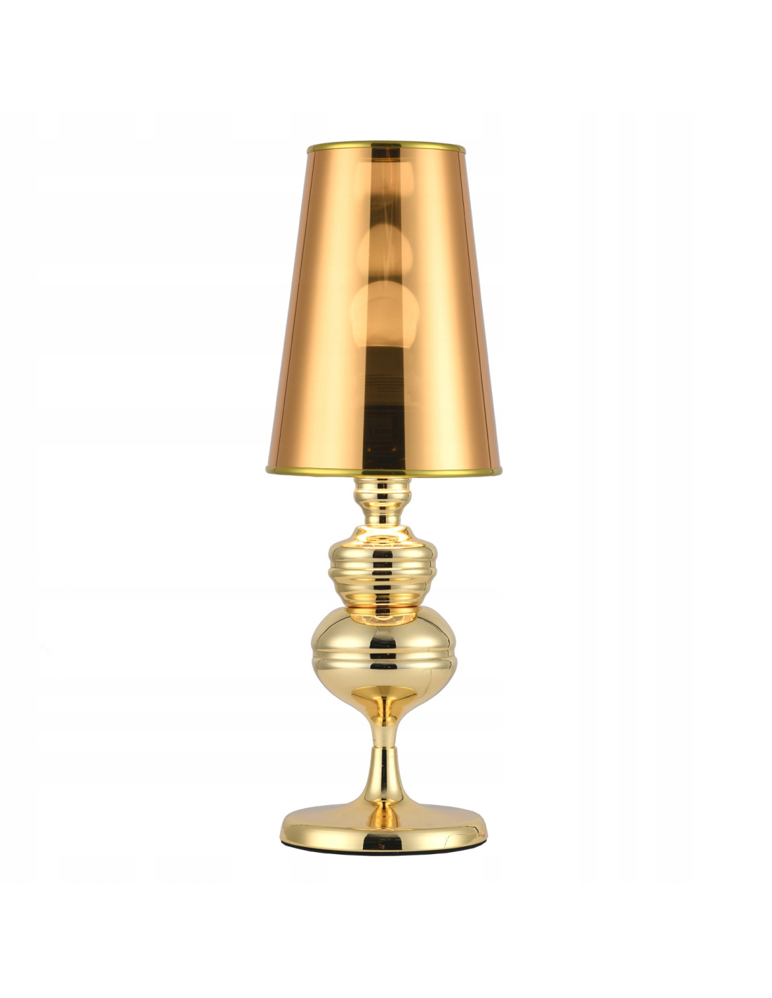 Lampa QUEEN zachwyca jednolitym wykończeniem z lustrzanego złota, co sprawia, że jest nie tylko praktycznym źródłem światła, ale także gustownym elementem dekoracyjnym. Podstawa lampy, wykonana z polerowanego aluminium, odbija światło, tworząc ciepłą aurę w pomieszczeniu, a złoty abażur dodaje jej ekskluzywnego charakteru.