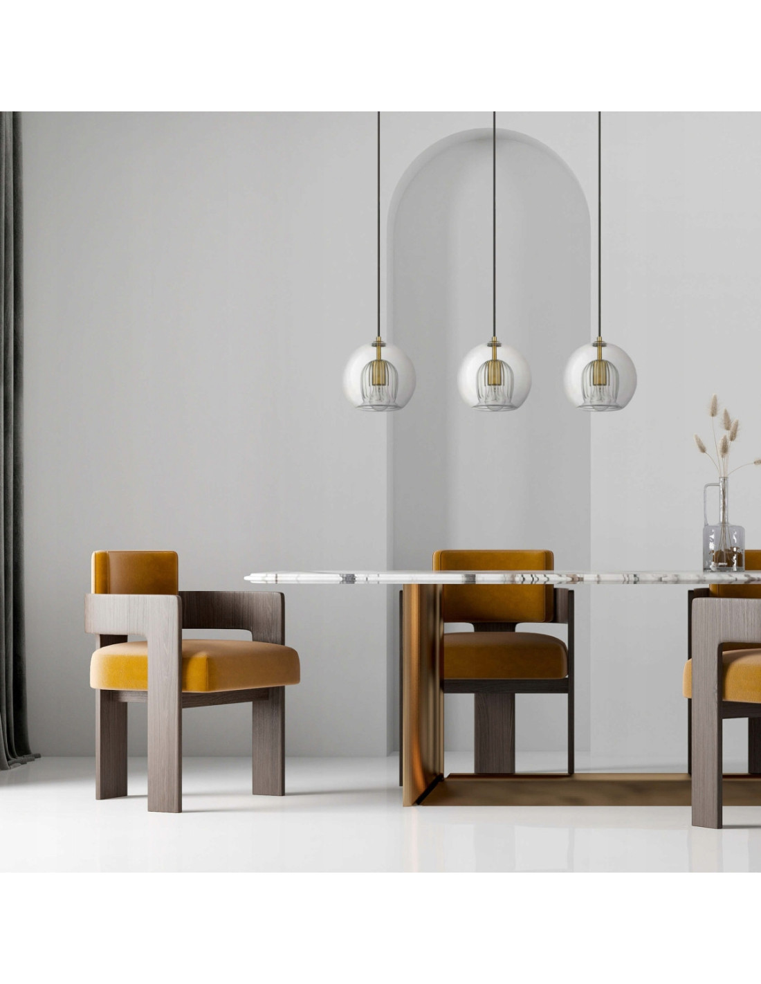 Potrójna zwisająca lampa sufitowa ARETTE to wyjątkowy element oświetleniowy, który z pewnością przyciągnie wzrok w każdym wnętrzu. Jej szykowne złote wykończenia harmonijnie łączą elegancję z nowoczesnym designem, co czyni ją idealnym wyborem dla osób ceniących sobie styl glamour. To doskonała propozycja dla tych, którzy pragną wprowadzić do swojego domu nutę luksusu oraz przytulnej atmosfery.