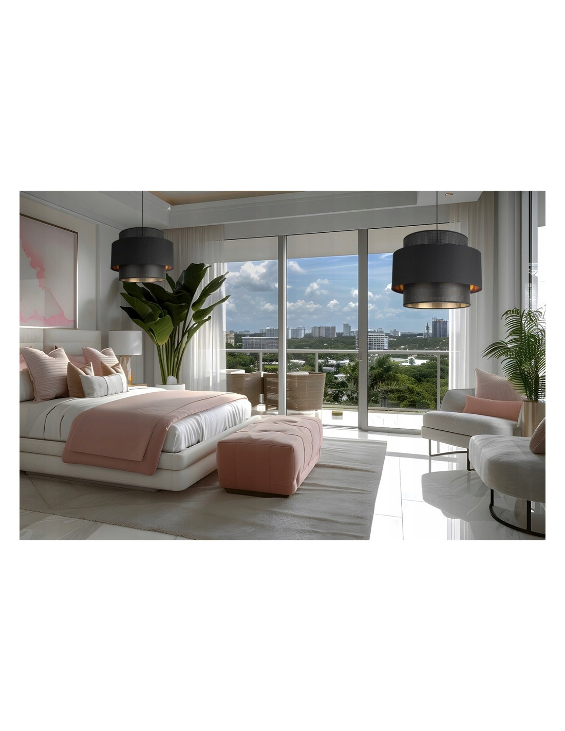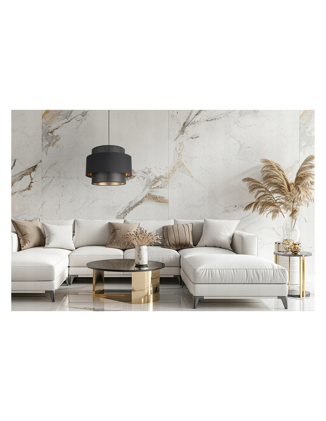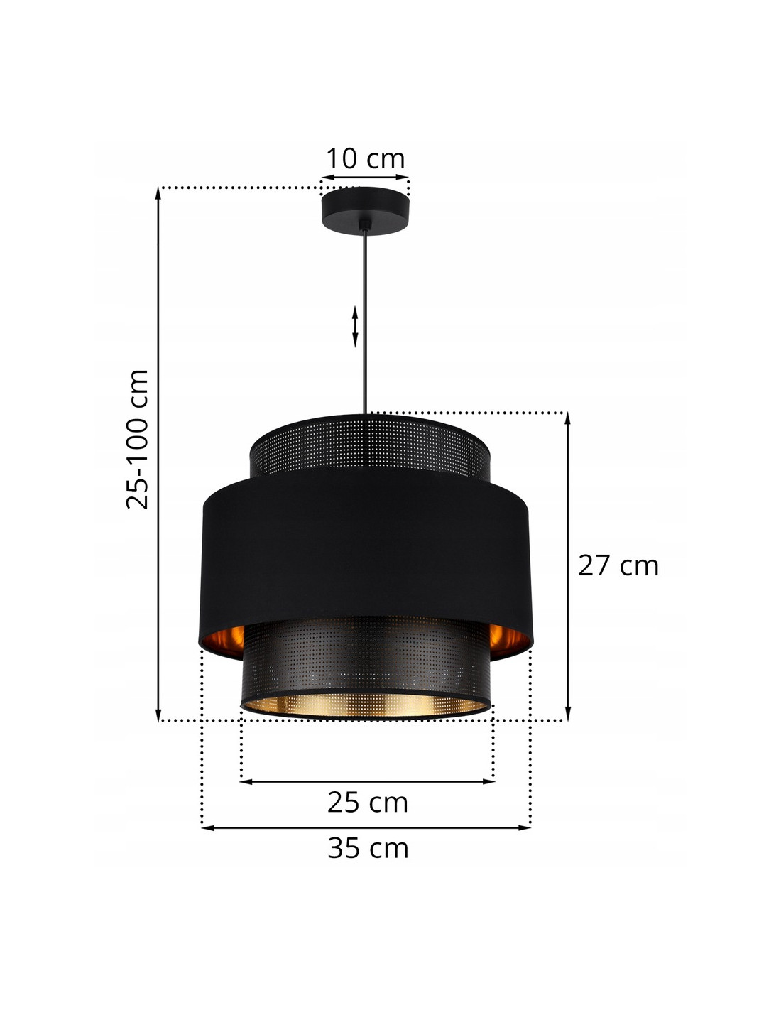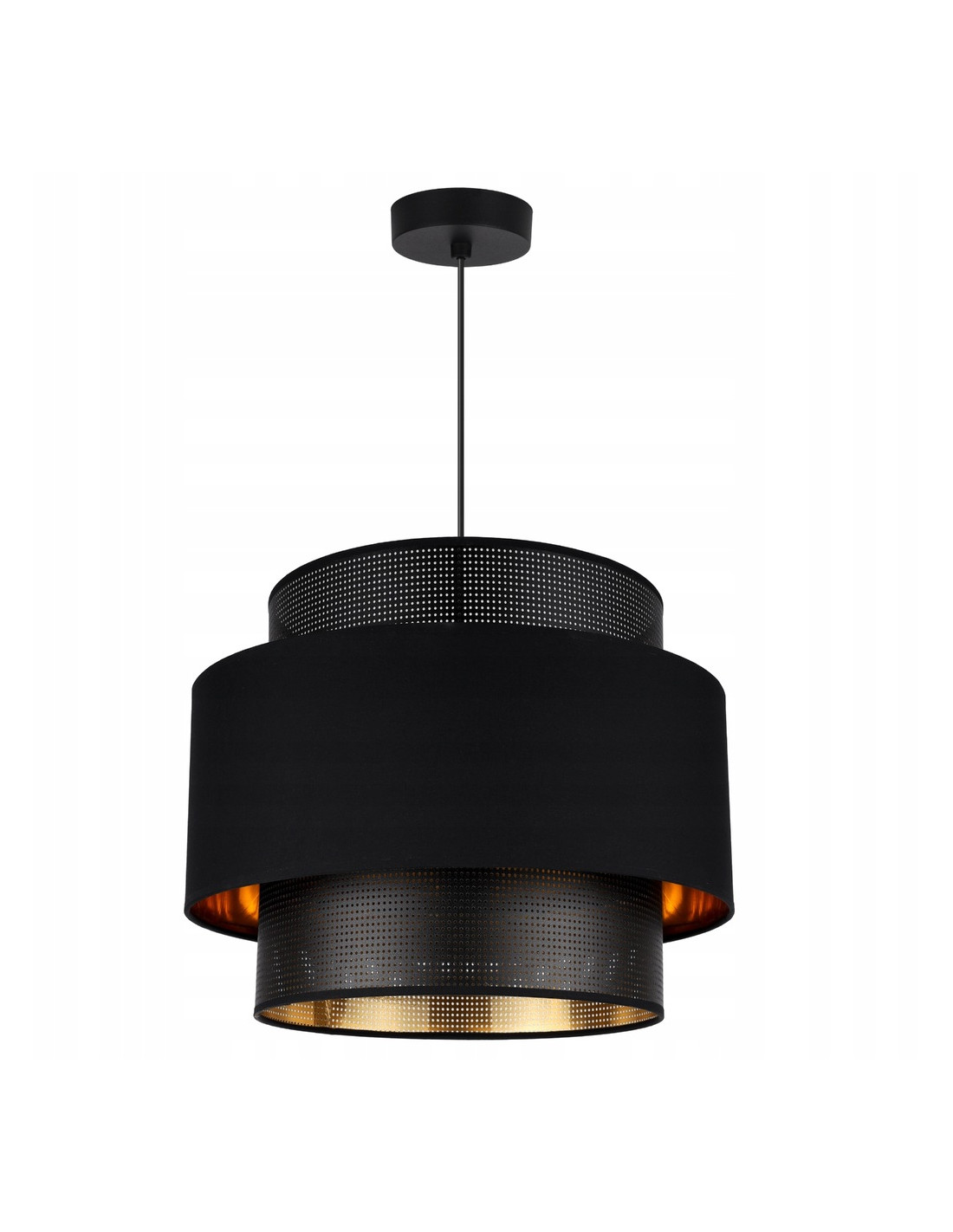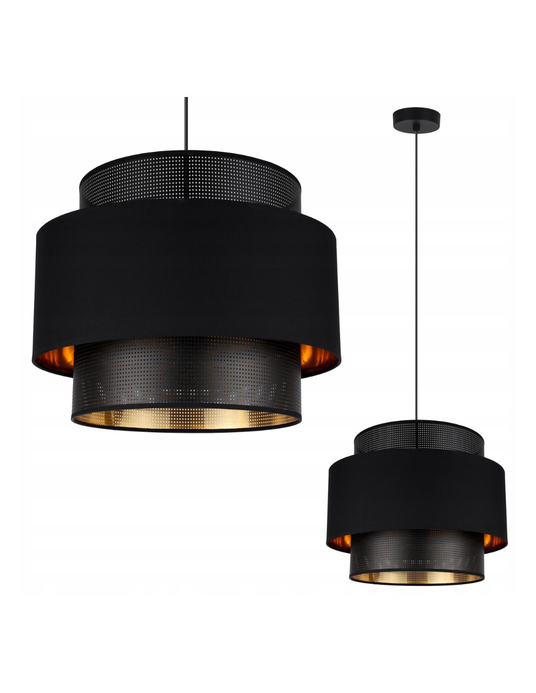 Zaokrąglony abażur o średnicy 35 cm stanowi idealne źródło światła, czyniąc go centralnym punktem w sypialni, salonie lub jadalni. Jego elegancka forma oraz modne połączenie białej lub czarnej tkaniny z złotym tworzywem sztucznym doskonale wpisuje się w styl glamour, dodając przestrzeni niepowtarzalnego charakteru.