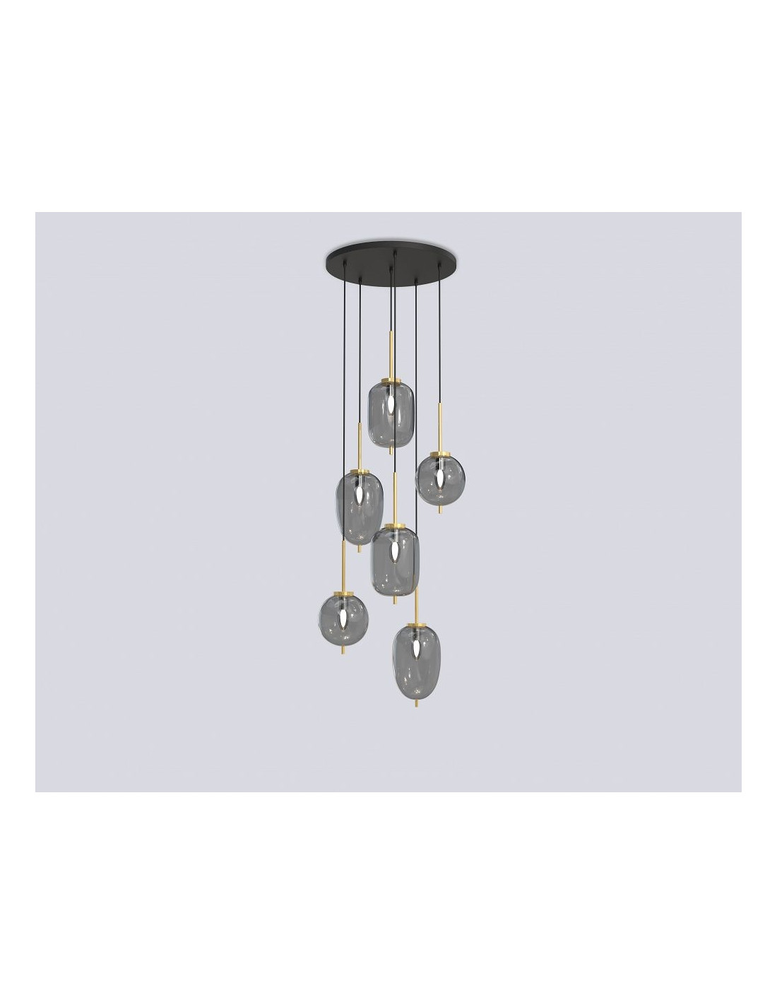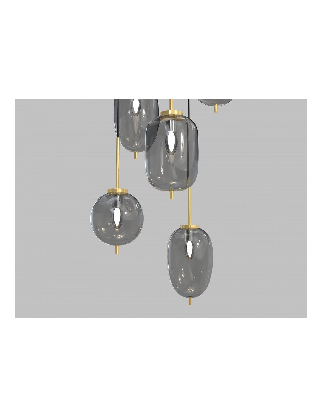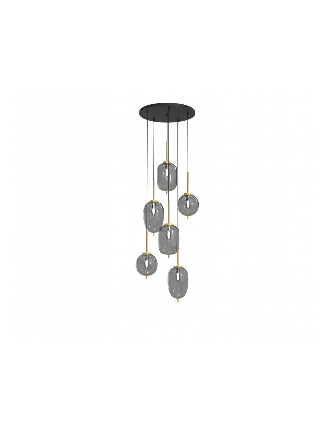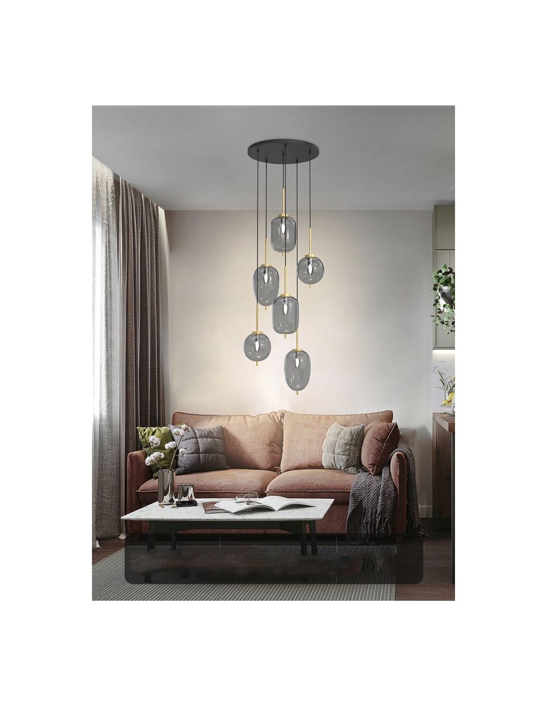 Lampa BELLEVILLE charakteryzuje się wielością kształtów kloszy, wykonanych z przydymionego szkła, co wprowadza elegancki i subtelny akcent do każdego wnętrza. Jej czarny kolor oraz delikatne złote dodatki doskonale harmonizują z innymi elementami wyposażenia, pozwalając na stworzenie spójnej koncepcji aranżacyjnej.