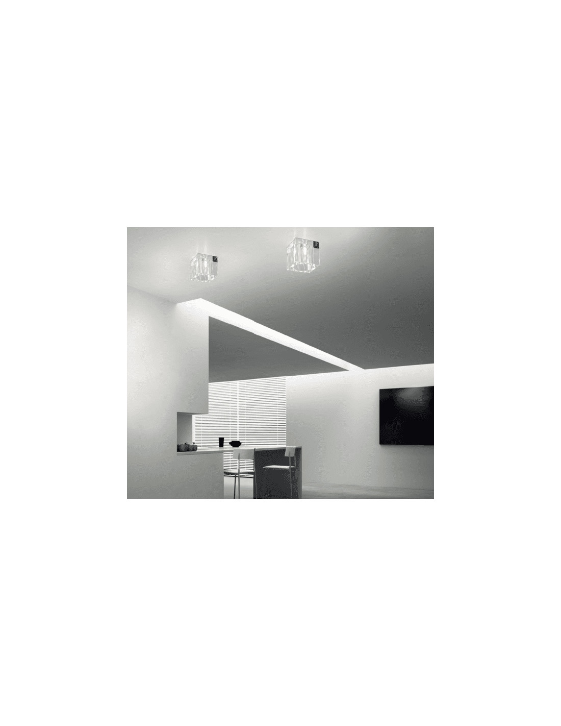 Plafon Cubo Claro wyróżnia się kwadratowym kształtem, który dodaje mu charakteru i szyku. Transparentne elementy z grubego szkła współtworzą z lampą harmonijną całość, delikatnie rozpraszając światło i tworząc lustro efektów. Dzięki tym właściwościom lampa idealnie eksponuje swoje atuty w pomieszczeniach o różnym stylu aranżacyjnym.
