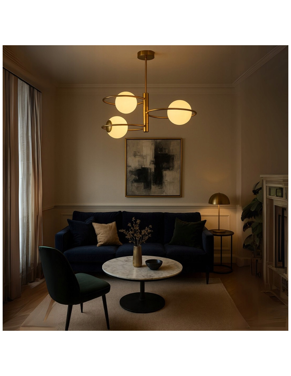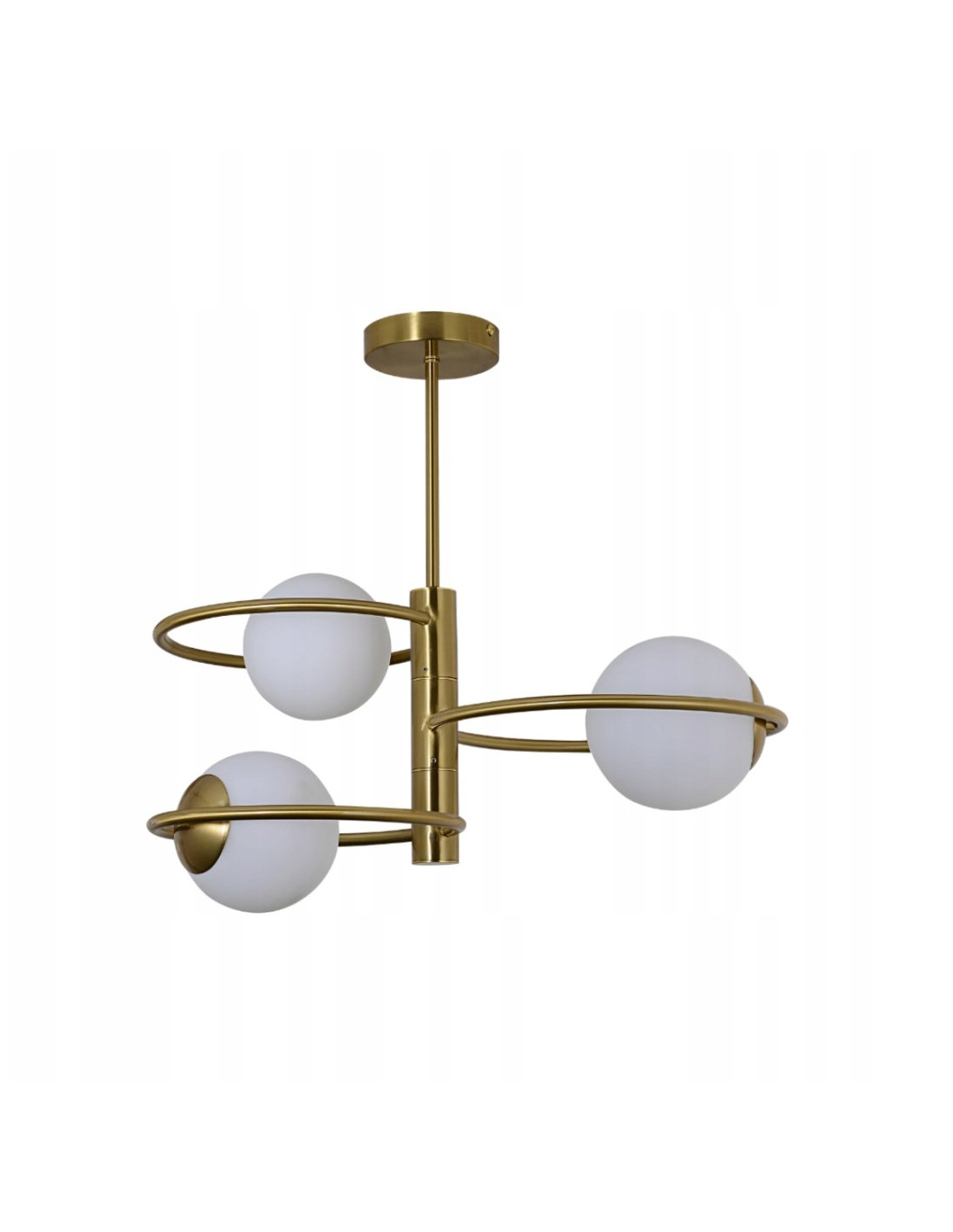 Lampa wyposażona jest w trzy okrągłe klosze wykonane z mlecznego szkła, które zapewniają przyjemne i równomierne oświetlenie. Możliwość użycia żarówek z gwintem E14 daje dużą elastyczność w doborze źródeł światła, co pozwala na osiągnięcie pożądanej atmosfery i nastroju w pomieszczeniu.