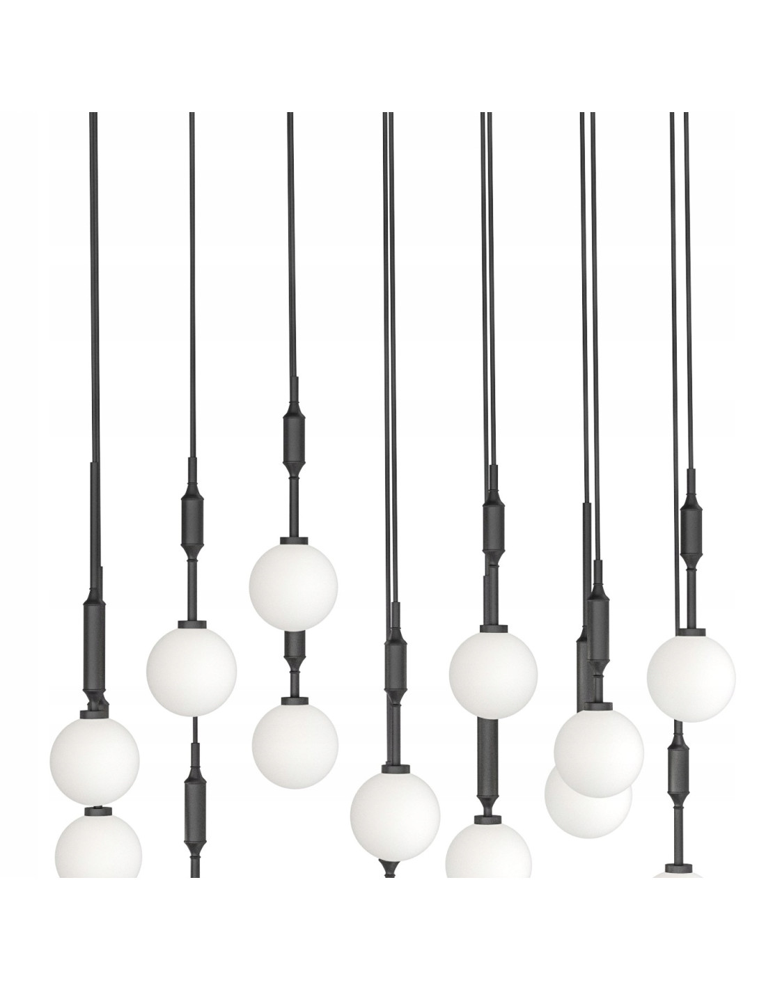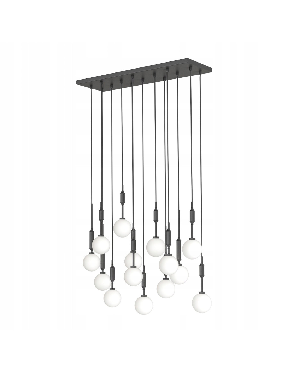Wykonana z wysokiej jakości materiałów, lampa Ero XIV Nero 80×25 charakteryzuje się metalowym korpusem w kolorze czarnym, który w połączeniu z białymi, opalowymi kulami tworzy harmonijną całość. Czternaście źródeł światła, które można dostosować do indywidualnych potrzeb, świadczy o jej funkcjonalności oraz estetyce. Regulowana wysokość zawieszenia pozwala na łatwe dostosowanie oświetlenia do charakteru pomieszczenia.