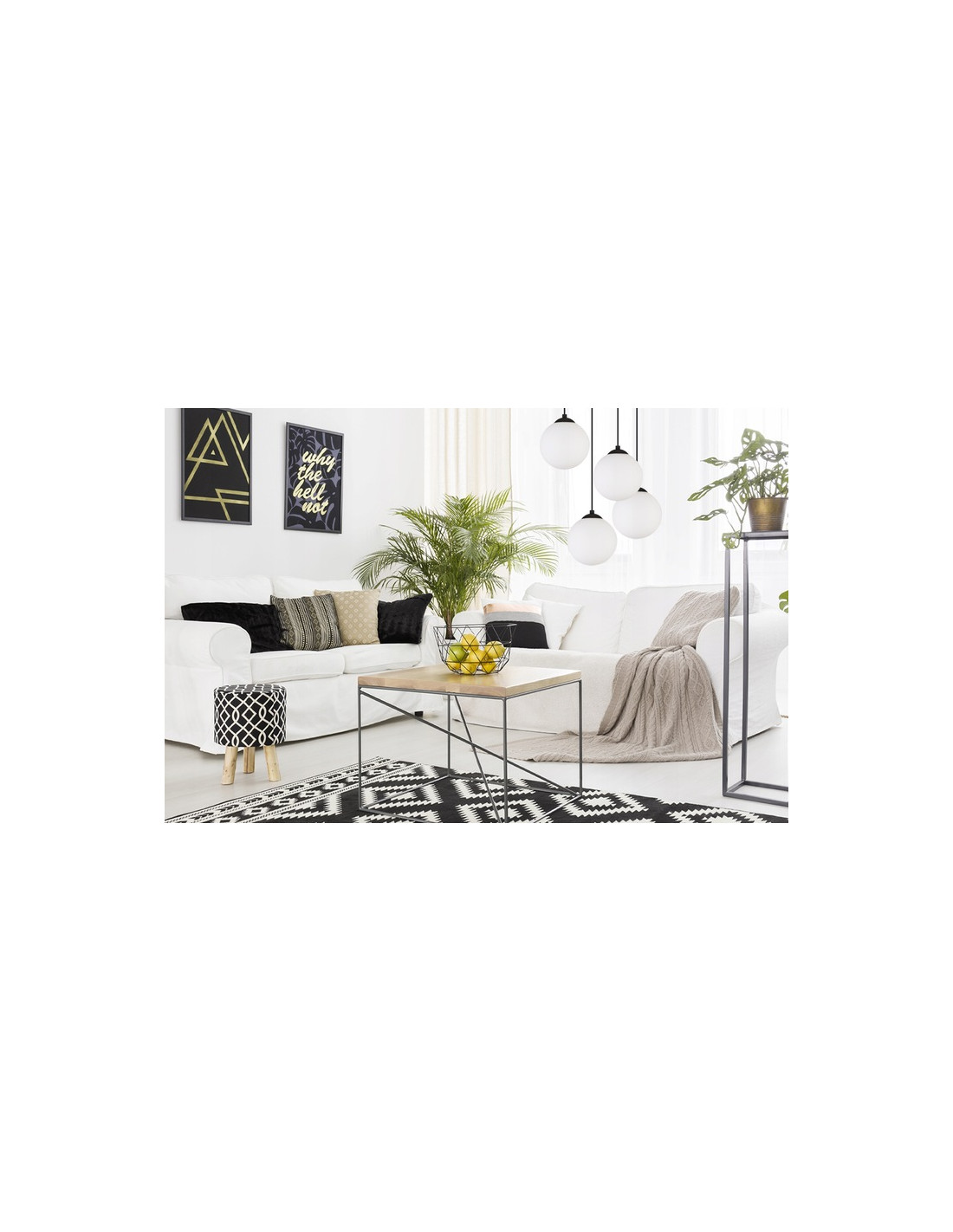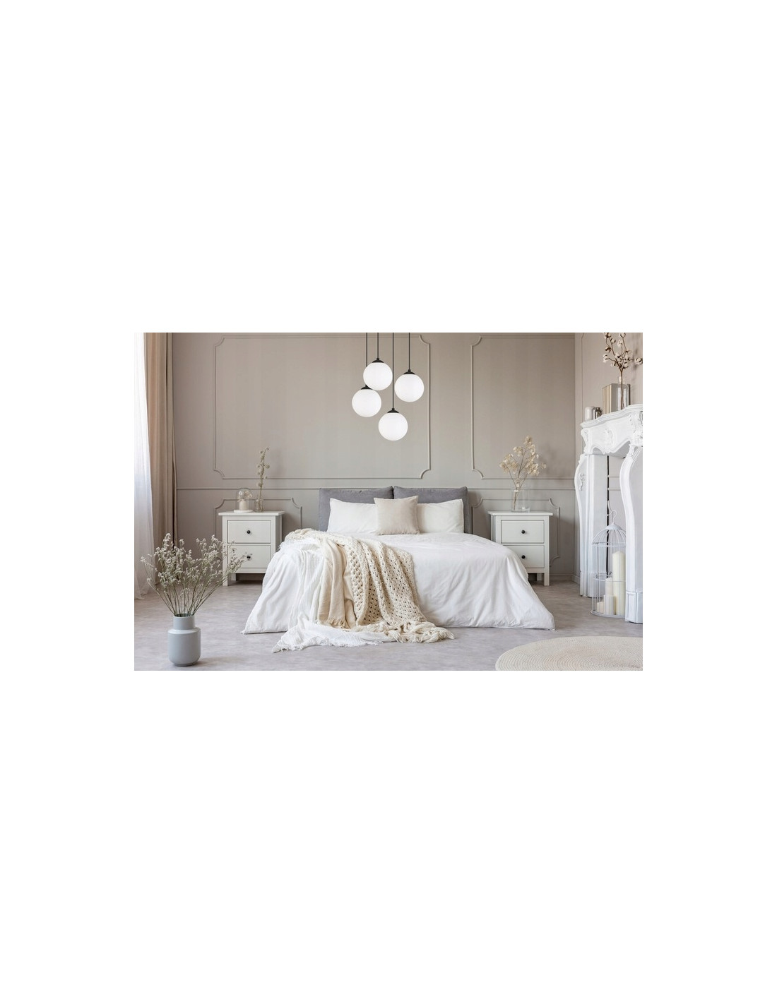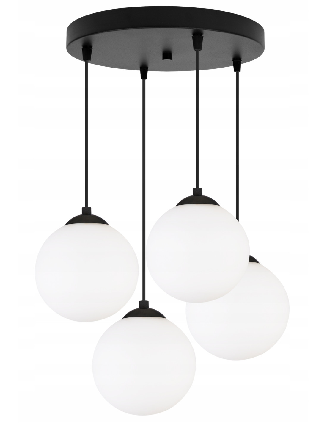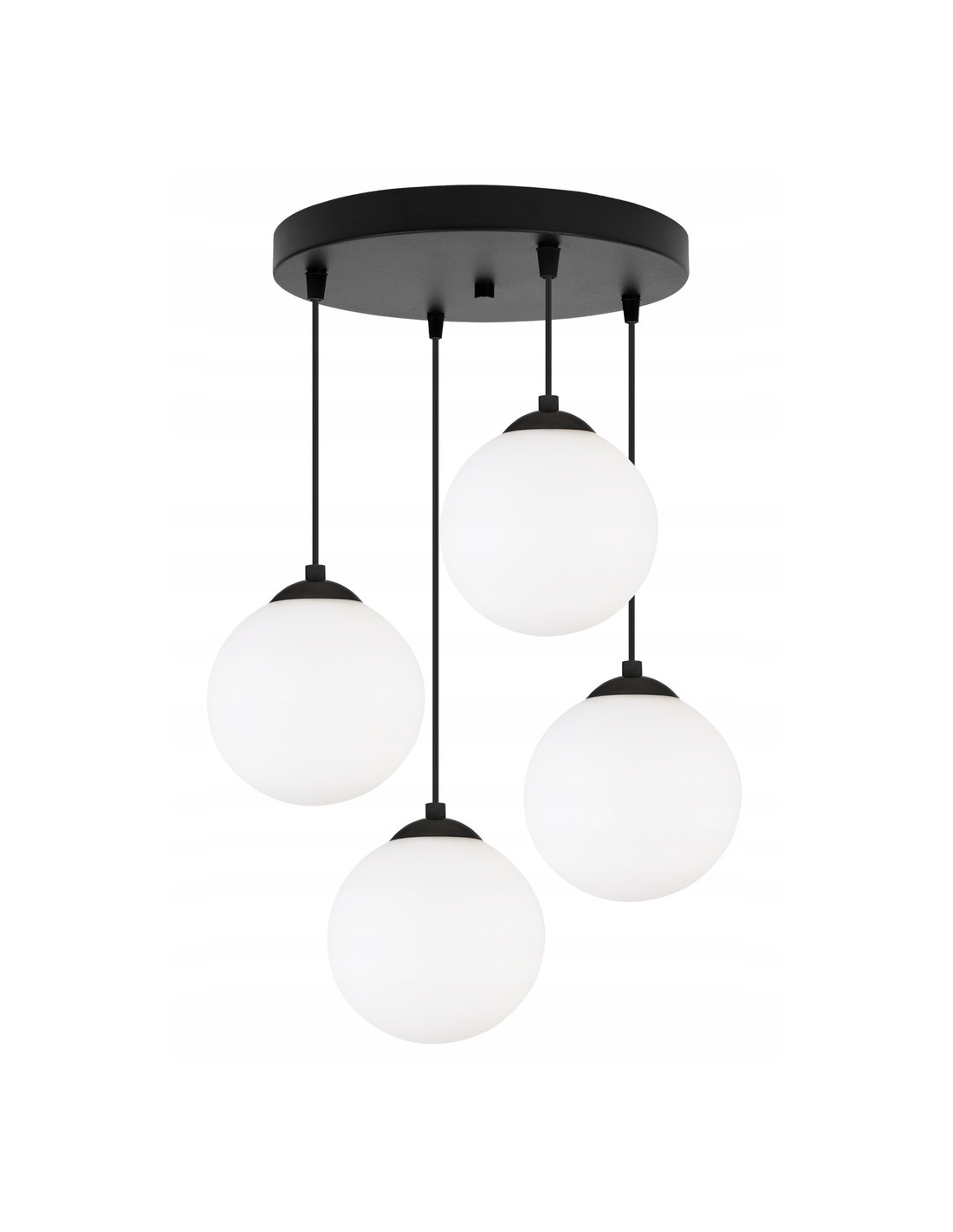 Produkt został zaprojektowany z dbałością o najmniejsze detale. Czarna okrągła podsufitka oraz cztery kule z mlecznego szkła tworzą harmonijną całość, idealną do różnorodnych miejsc, takich jak: