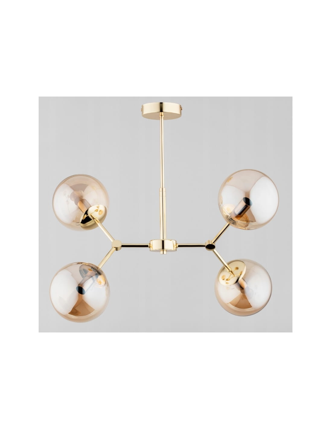 Przedstawiamy lampę sufitową FOTON, wyjątkowy element oświetlenia, który doskonale łączy nowoczesny styl z elegancją. Dzięki zastosowaniu szklanych kloszy w kolorze bursztynowym, lampa emanuje przytulnym i ciepłym światłem, tworząc niepowtarzalną atmosferę w każdym wnętrzu. Metalowe elementy w kolorze złotym podkreślają jej wysoką estetykę, co czyni ją idealnym rozwiązaniem do salonu, sypialni, przedpokoju oraz biura.