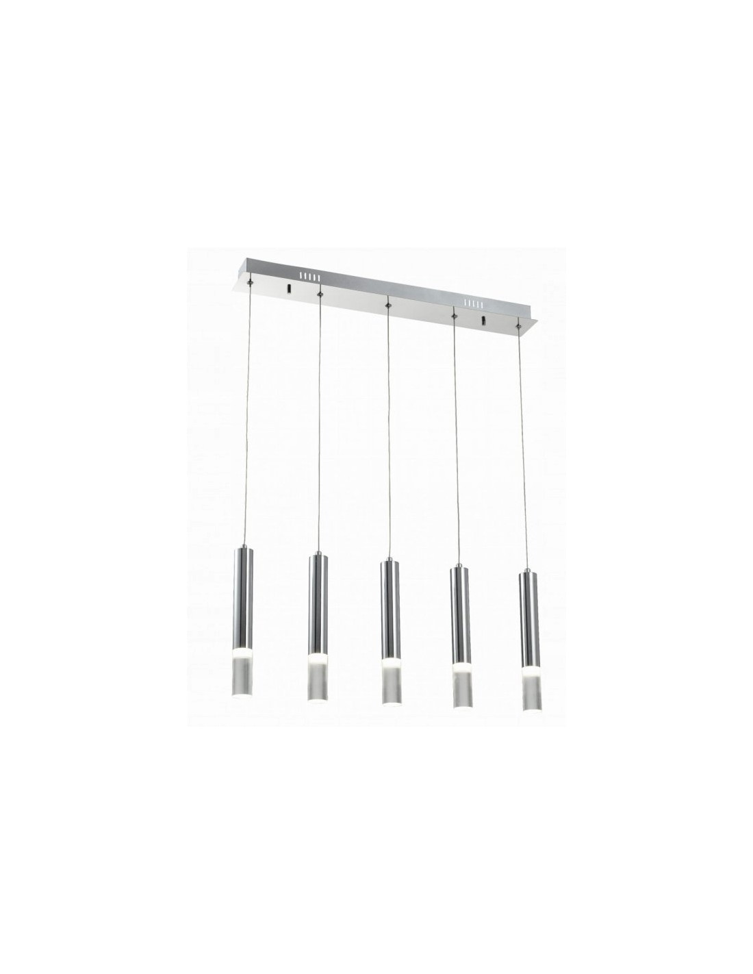 Lampa składa się z długiego cylindrycznego klosza, wykonanego z chromowanego metalu, który zapewnia nie tylko trwałość, ale także estetyczny wygląd. Zawieszona na cienkim, przezroczystym przewodzie, stwarza wrażenie lekkości i przestronności. Wyjątkowym elementem jest przezroczysty fragment na dolnej części klosza, który delikatnie rozprasza światło, tworząc przytulną atmosferę w pomieszczeniu.