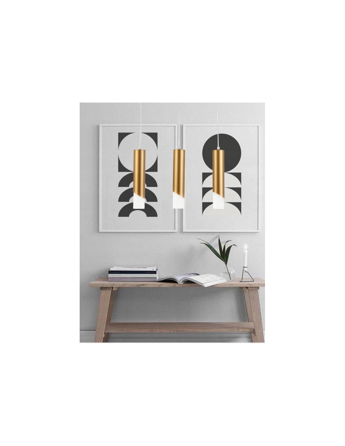 Odkryj lampa Hardin, nowoczesną wiszącą lampę sufitową, która łączy w sobie minimalistyczny design z elegancją. Jej stylowy, złoty klosz w formie długiego, cylindrycznego kształtu, który zwęża się ku dołowi, przyciąga wzrok i dodaje wyjątkowego charakteru do każdego wnętrza. Lampa jest zawieszona na cienkim, czarnym przewodzie, co podkreśla jej nowoczesny wygląd.