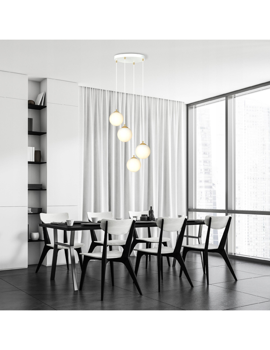 Lampa wyróżnia się innowacyjną konstrukcją oraz długimi przewodami, co pozwala na wiele możliwości aranżacyjnych. Idealnie nadaje się do wysokich przestrzeni, gwarantując wyjątkowy efekt wizualny. Jej szklane klosze oferują elegancki wygląd, który doskonale harmonizuje z pozostałymi elementami wnętrza.