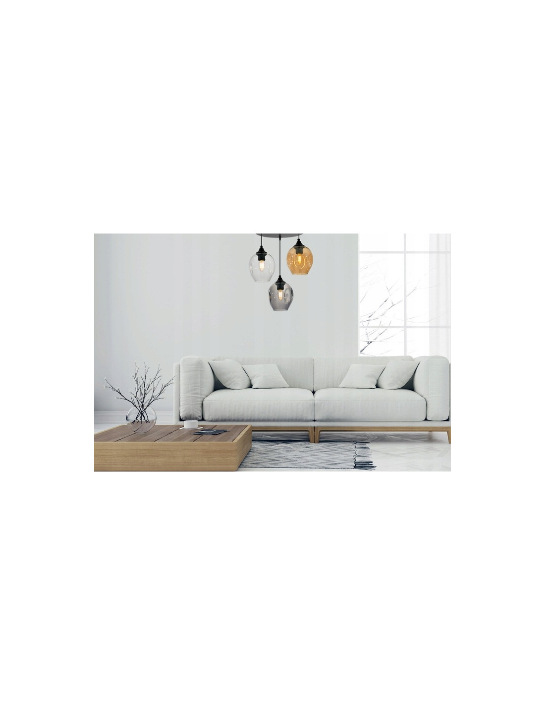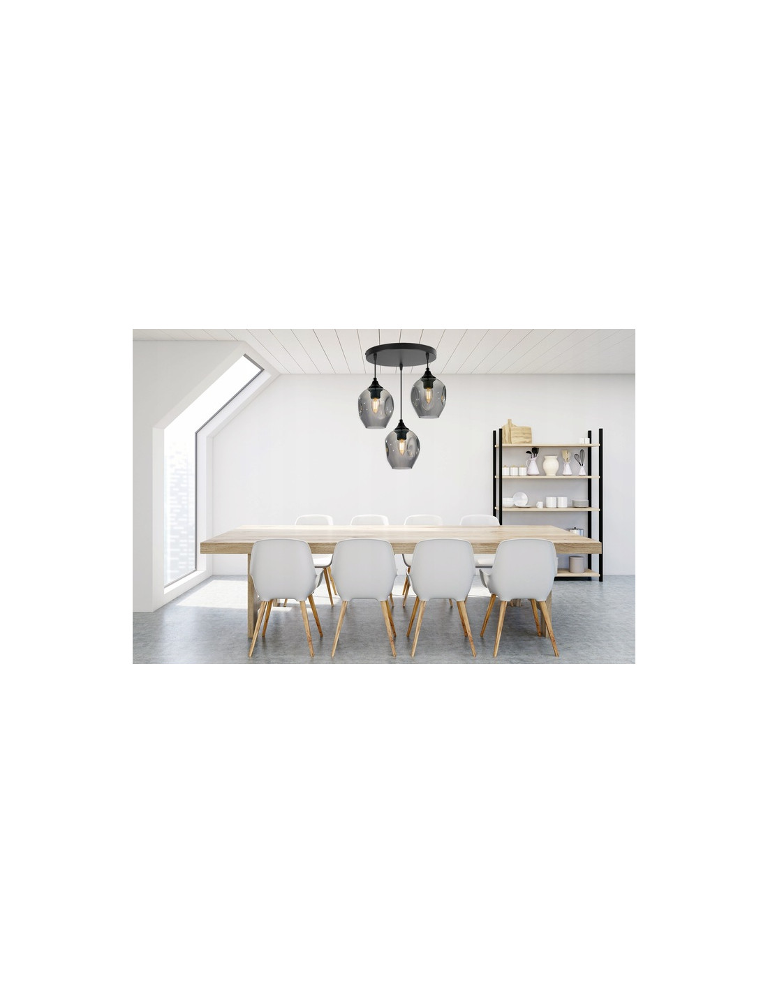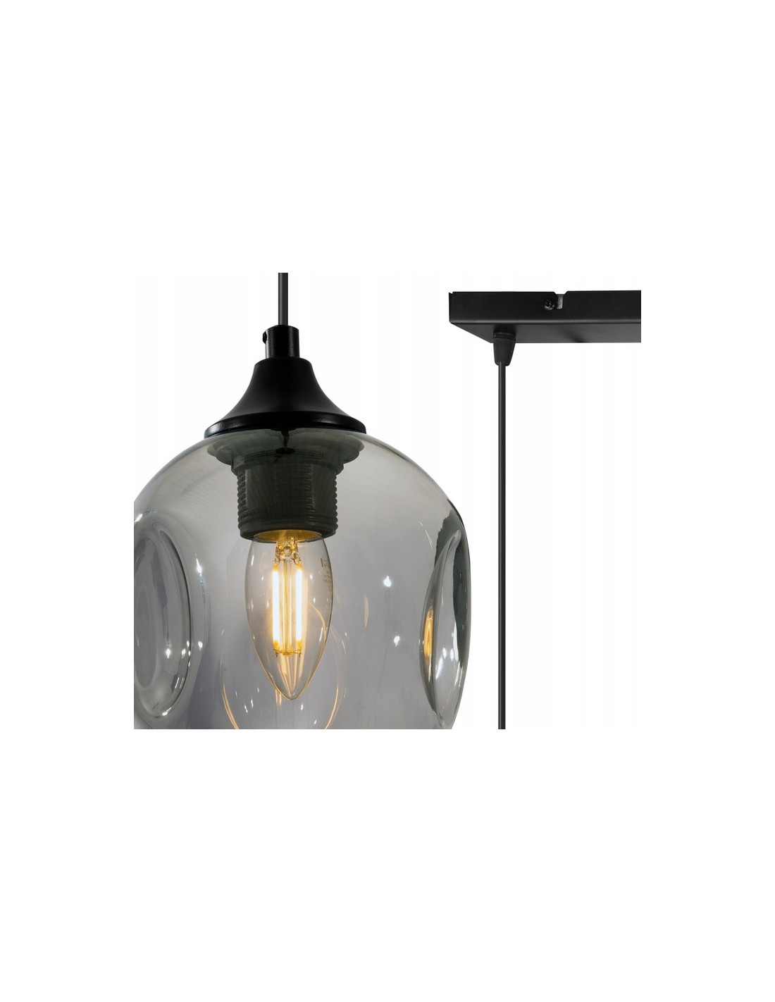 Wyróżnia ją innowacyjna konstrukcja, w której połączono okrągłe, transparentne klosze w kolorze dymionym z eleganckim, czarnym stelażem. Klosze te delikatnie rozpraszają światło, tworząc przyjemną atmosferę i subtelny blask, który umila chwile zarówno w codziennym użytkowaniu, jak i podczas spotkań towarzyskich.