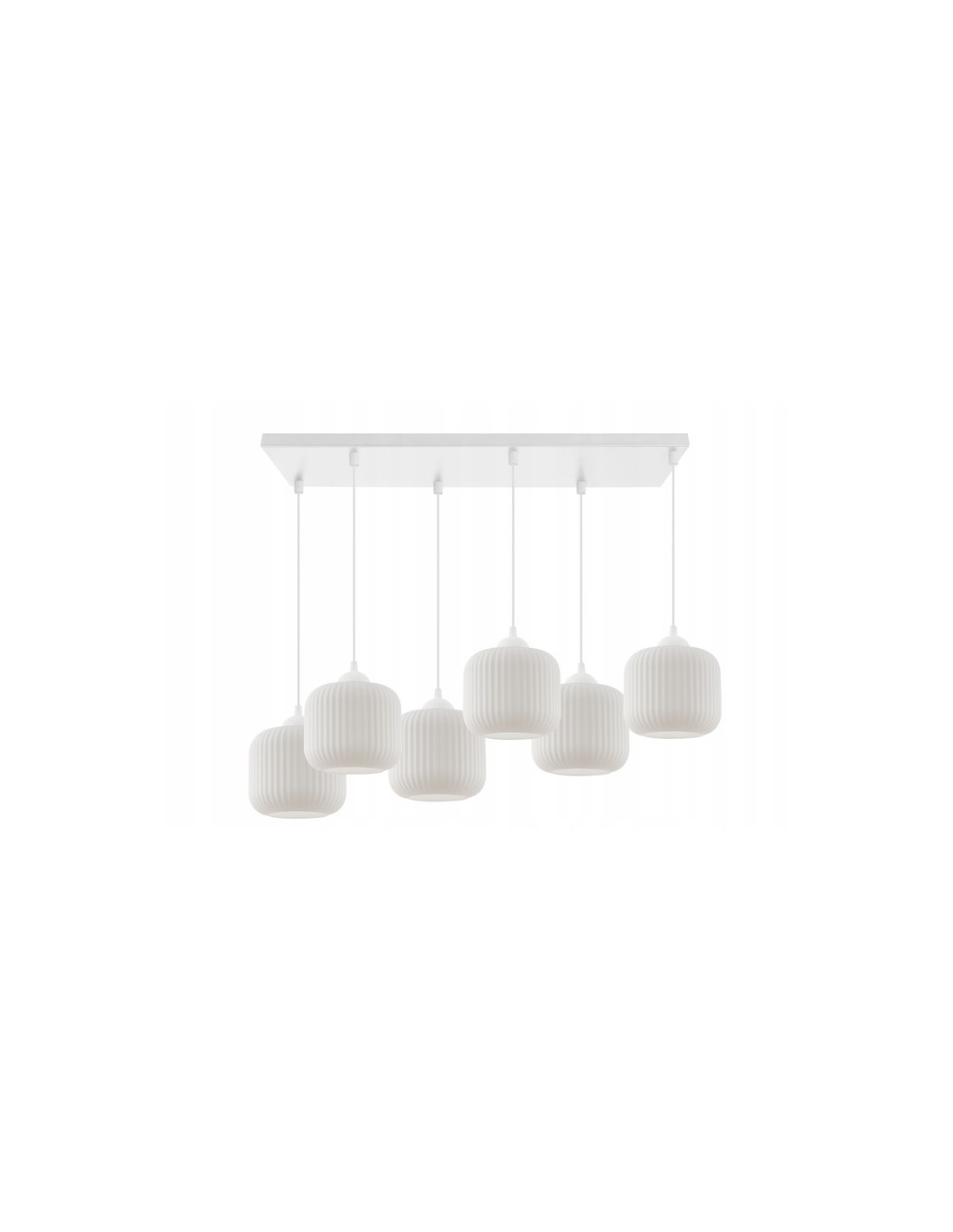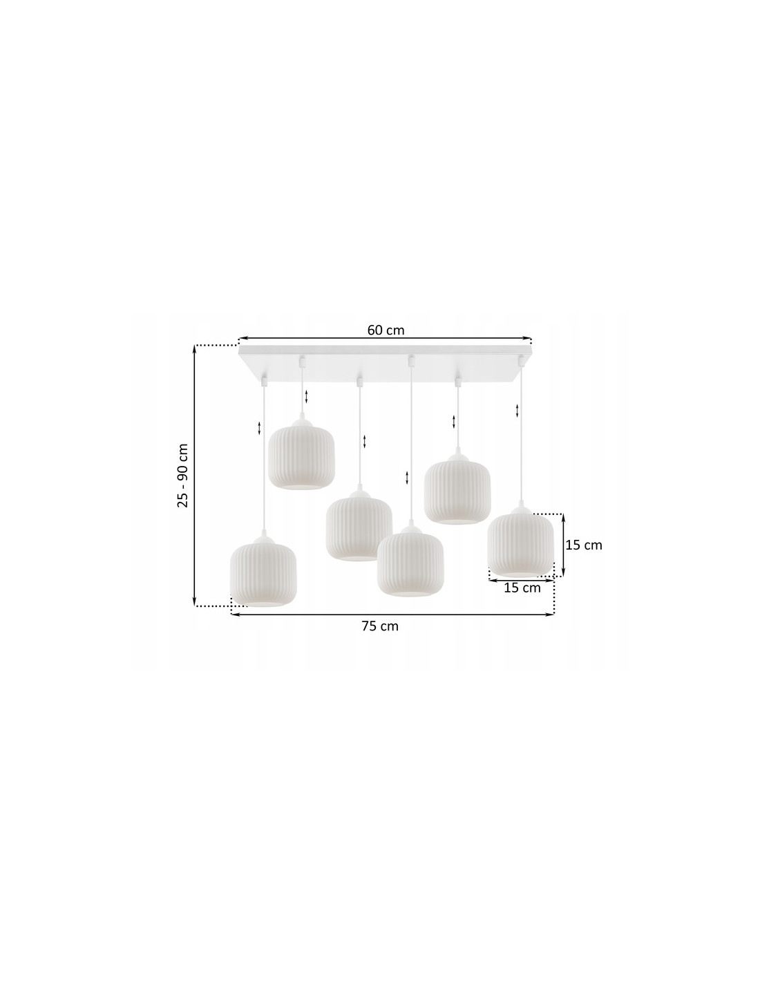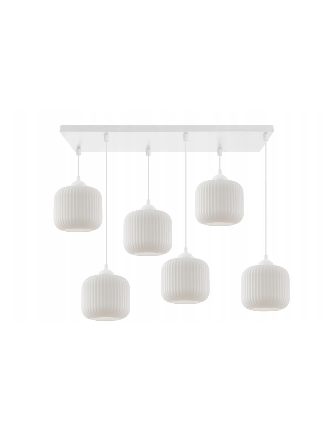 Lampa RIFFLE wyróżnia się modną konstrukcją w kształcie walca, która została ozdobiona białymi, szklanymi kloszami montowanymi na eleganckiej podsufitce. Ten subtelny akcent nie tylko wnosi do przestrzeni elegancję, ale także doskonale odbija światło, tworząc przyjemną atmosferę. Jest to świetne rozwiązanie do oświetlenia centralnego nad stołem w jadalni, wyspą w kuchni czy strefą wypoczynkową w salonie.