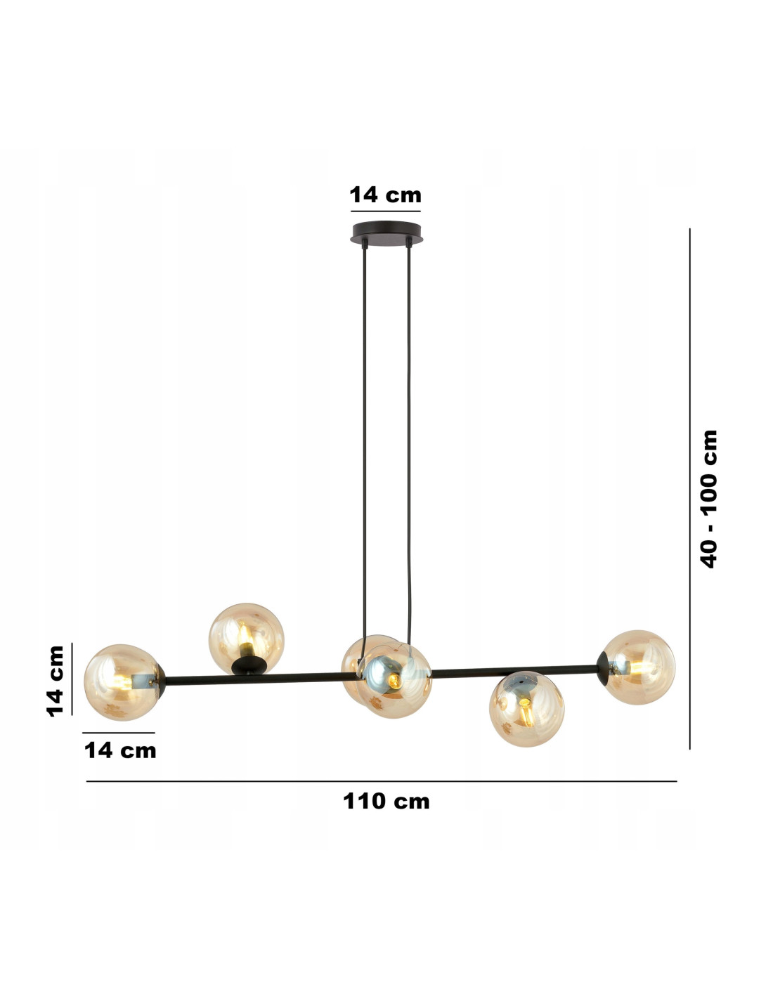 Produkt został wykonany z wysokiej jakości materiałów, takich jak metal i szkło, co gwarantuje trwałość oraz estetyczny wygląd. Lampa ma maksymalną wysokość 100 cm, szerokość 110 cm oraz głębokość 14 cm. Dzięki tym wymiarom z łatwością wkomponujesz ją w różne przestrzenie.