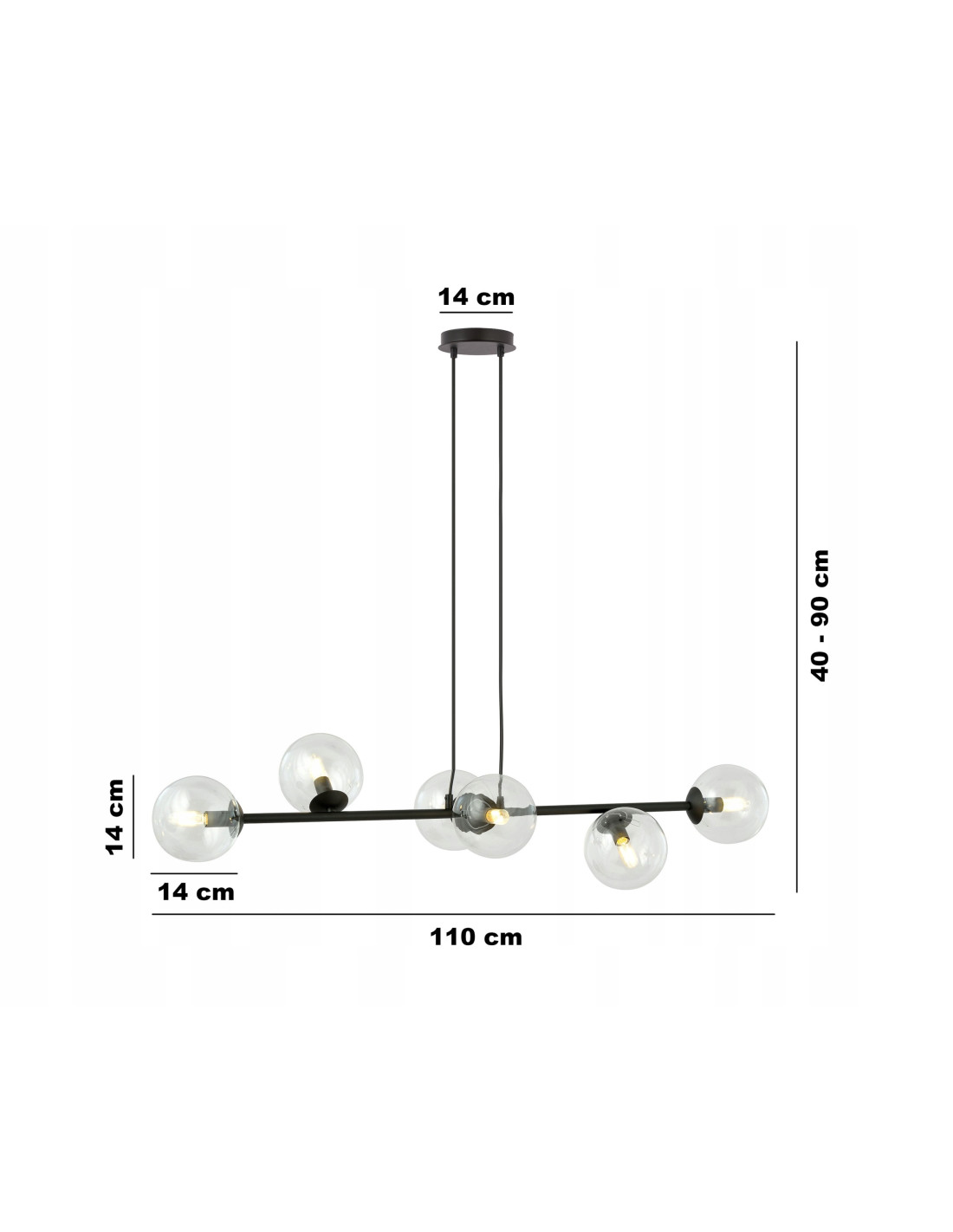 Wymiary lampy są dostosowane do różnych przestrzeni, co czyni ją idealnym rozwiązaniem zarówno do jadalni, jak i do salonu. Jej parametry to: wysokość maksymalna 100 cm, głębokość 14 cm, szerokość 110 cm. Zastosowanie 6 źródeł światła E14 gwarantuje nie tylko wygodę, ale także efektywność energetyczną, dzięki klasie efektywności A.