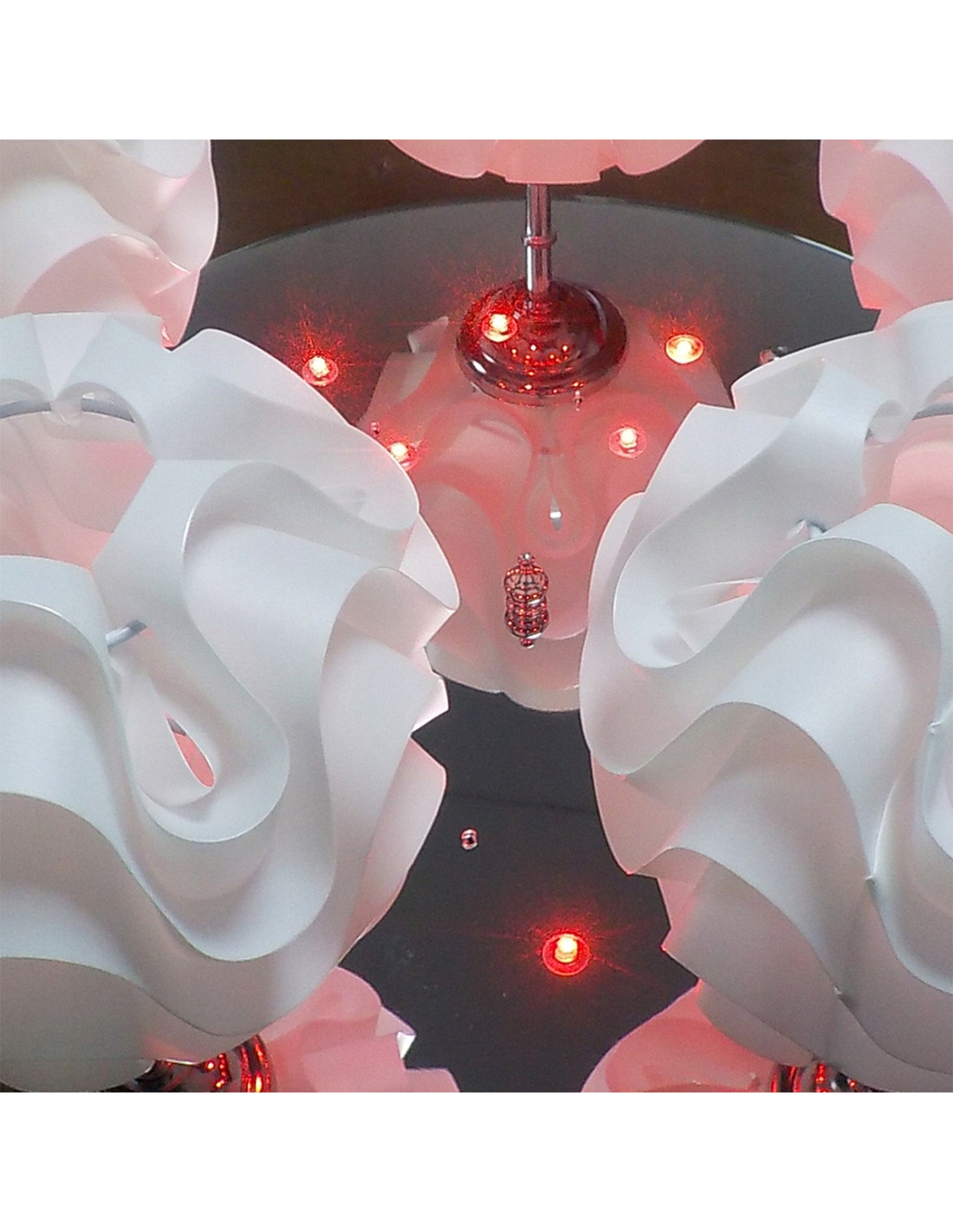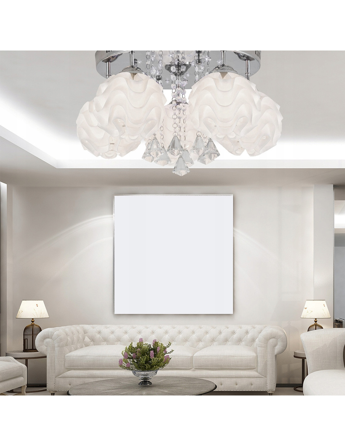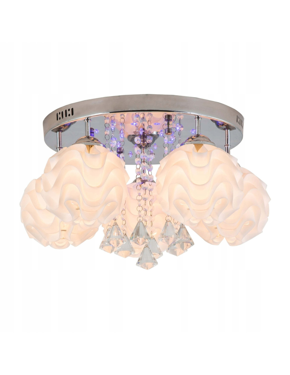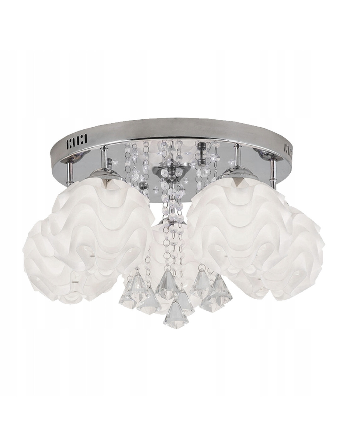 Plafon SADA wyróżnia się oryginalnymi punktami świetlnymi, które nadają mu unikalnego charakteru. Wyposażona w pięć białych kul o misternie rzeźbionej formie, przypominających puszyste obłoki, rozprasza światło w sposób subtelny i przytulny, tworząc niepowtarzalną atmosferę w każdym pomieszczeniu. Mleczne tworzywo, z którego wykonane są klosze, sprawia, że światło jest delikatne, co czyni tę lampę idealnym wyborem do salonu, holu czy jadalni.