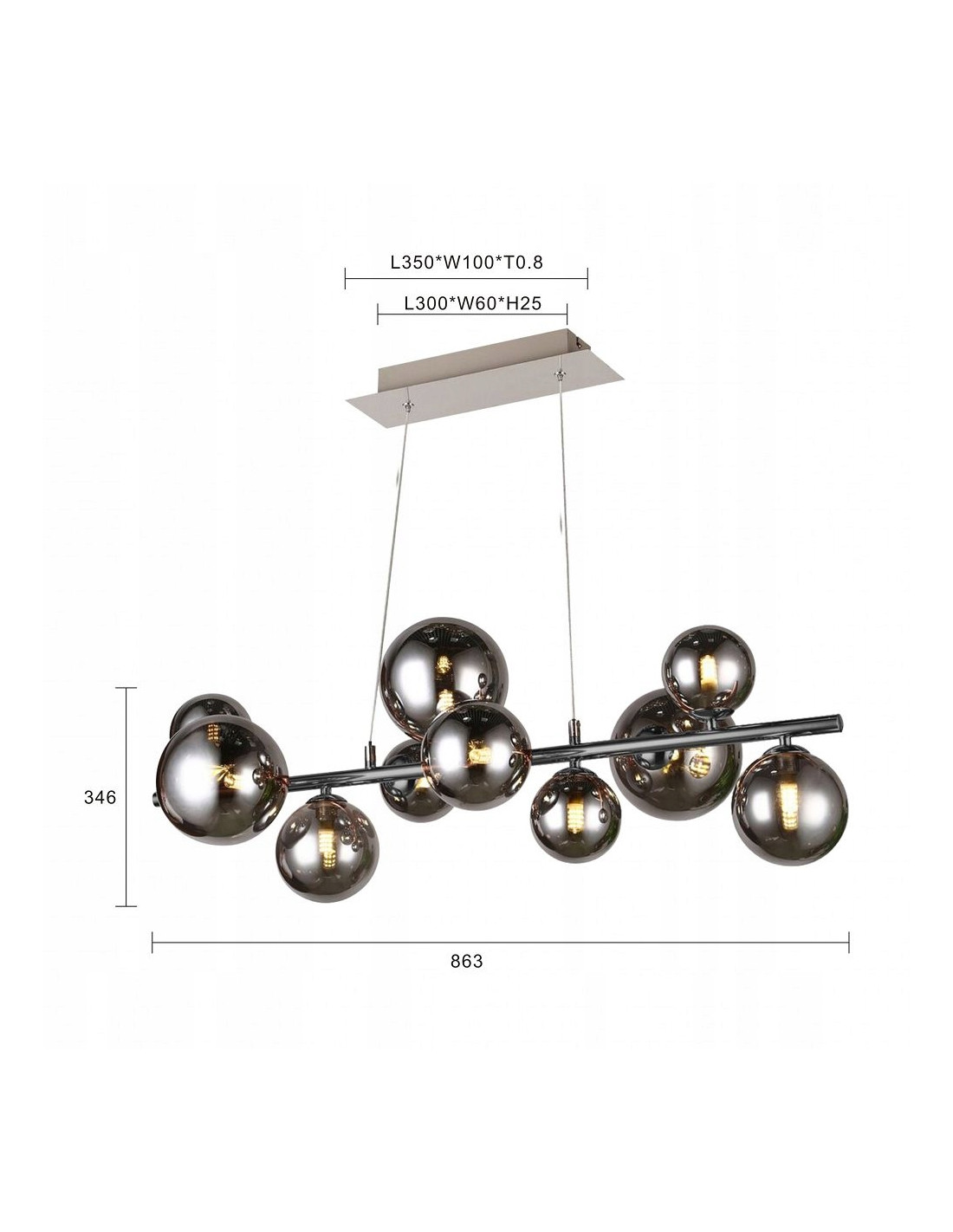 Wysokość lampy wynosi 150 cm, a jej szerokość 86 cm, co sprawia, że staje się centralnym punktem w każdym pomieszczeniu. Lampa wyposażona jest w 10 punktów świetlnych z gwintem G9, co pozwala na łatwą wymianę źródeł światła oraz dostosowanie mocy do indywidualnych potrzeb. Zastosowana moc żarówki wynosi 30 W, a barwa światła to biały ciepły o jasności 3500 lm.
