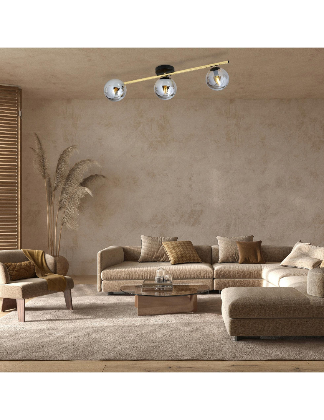 Wykonanie plafonu z wysokiej jakości materiałów zapewnia jego trwałość oraz estetykę. Szklane klosze w kształcie bańki nie tylko przyciągają wzrok, ale również dodają wnętrzu niepowtarzalnego charakteru. Dostępny w kolorze grafitowym z złotymi elementami, plafon wprowadza elementy glamour do Twojego domu, czyniąc go eleganckim oraz przytulnym miejscem.