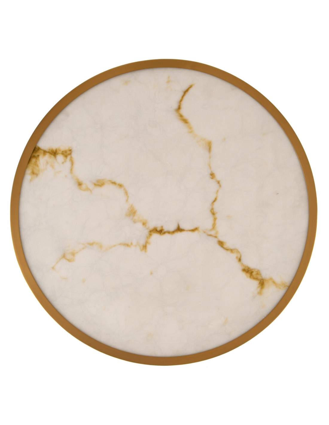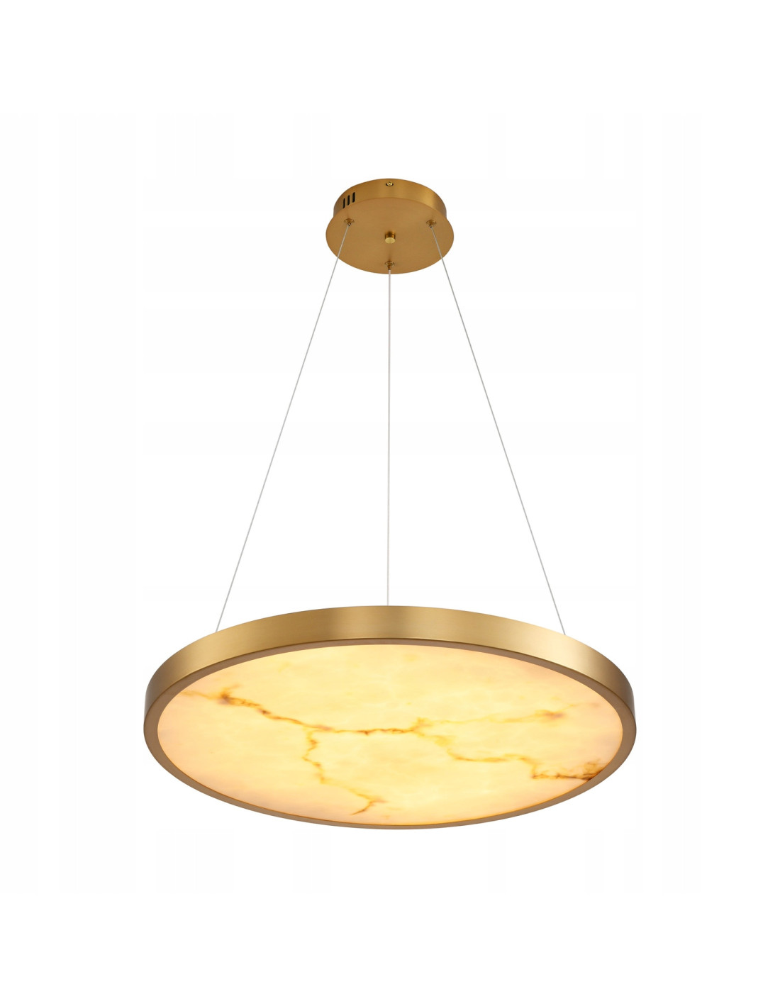 Klosz lampy ma okrągły, płaski kształt o średnicy 60 cm, przypominający dysk lub talerz, co nadaje jej nowoczesny i minimalistyczny wygląd. Pokryty jest metalem w kolorze szczotkowanego złota, co wyróżnia lampę i sprawia, że staje się centralnym punktem wystroju. Cienka, metalowa rama w kolorze złotym otacza klosz, dodając mu wdzięku i podkreślając jego elegancki charakter.