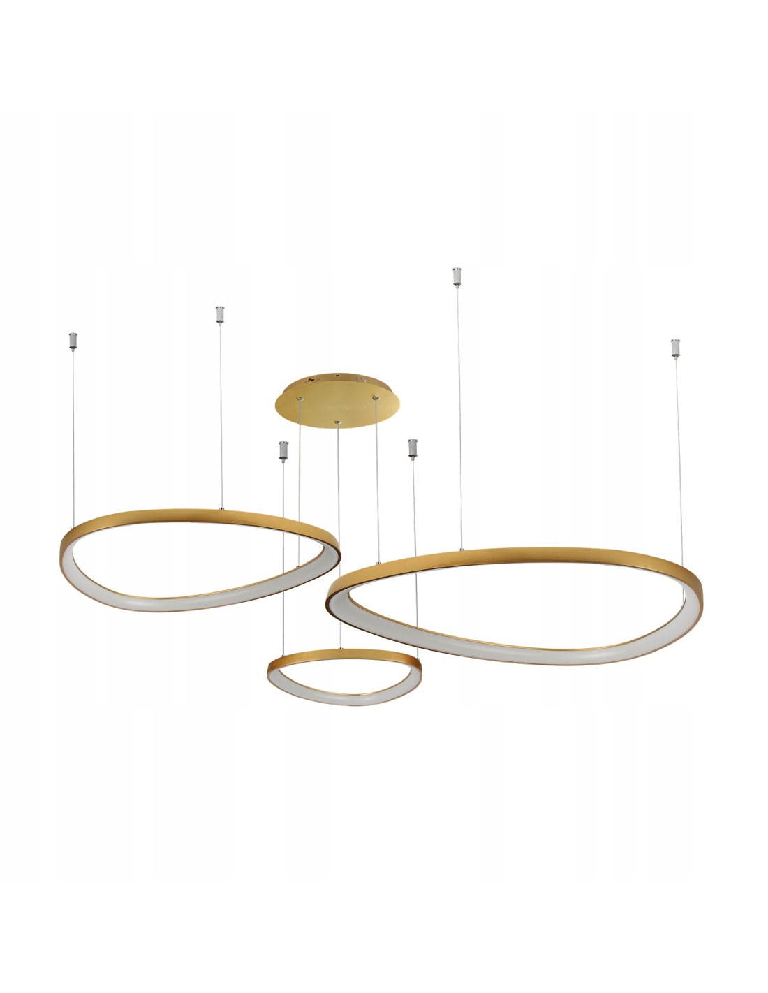 W zestawie z lampą znajduje się kompletny zestaw montażowy, co ułatwia jej instalację. Produkt objęty jest certyfikatem zgodności CE, co gwarantuje jego bezpieczeństwo oraz wysoką jakość. Złote gięte Ringi AMANDA PENDANT LED to idealna propozycja do biura, jadalni, salonu oraz sypialni, wpisując się w różnorodne potrzeby dekoracyjne każdego domu.
