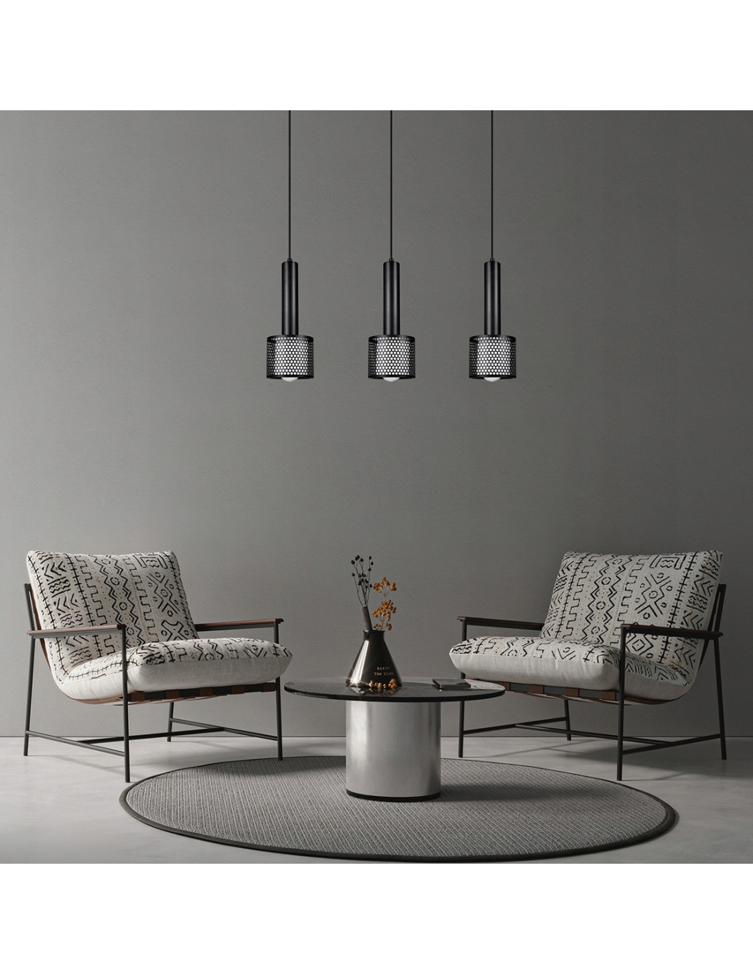 Trzy cylindryczne klosze w minimalistycznym stylu tworzą dynamiczną grę światła, co sprawia, że stają się one atrakcyjnym elementem dekoracyjnym w każdym pomieszczeniu. Efektowne oświetlenie nie tylko ożywi przestrzeń, ale także nada jej przytulną atmosferę. Lampa pięknie sprawdzi się nad wyspą kuchenną, w salonie czy jadalni, wypełniając je ciepłem i światłem.